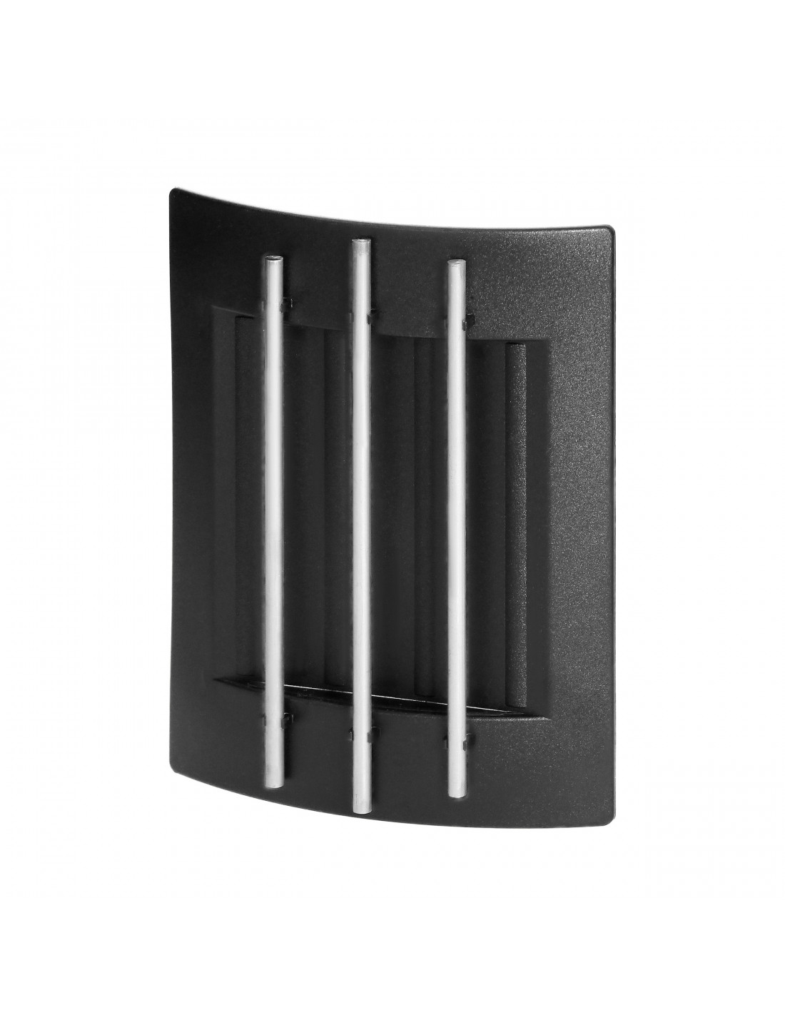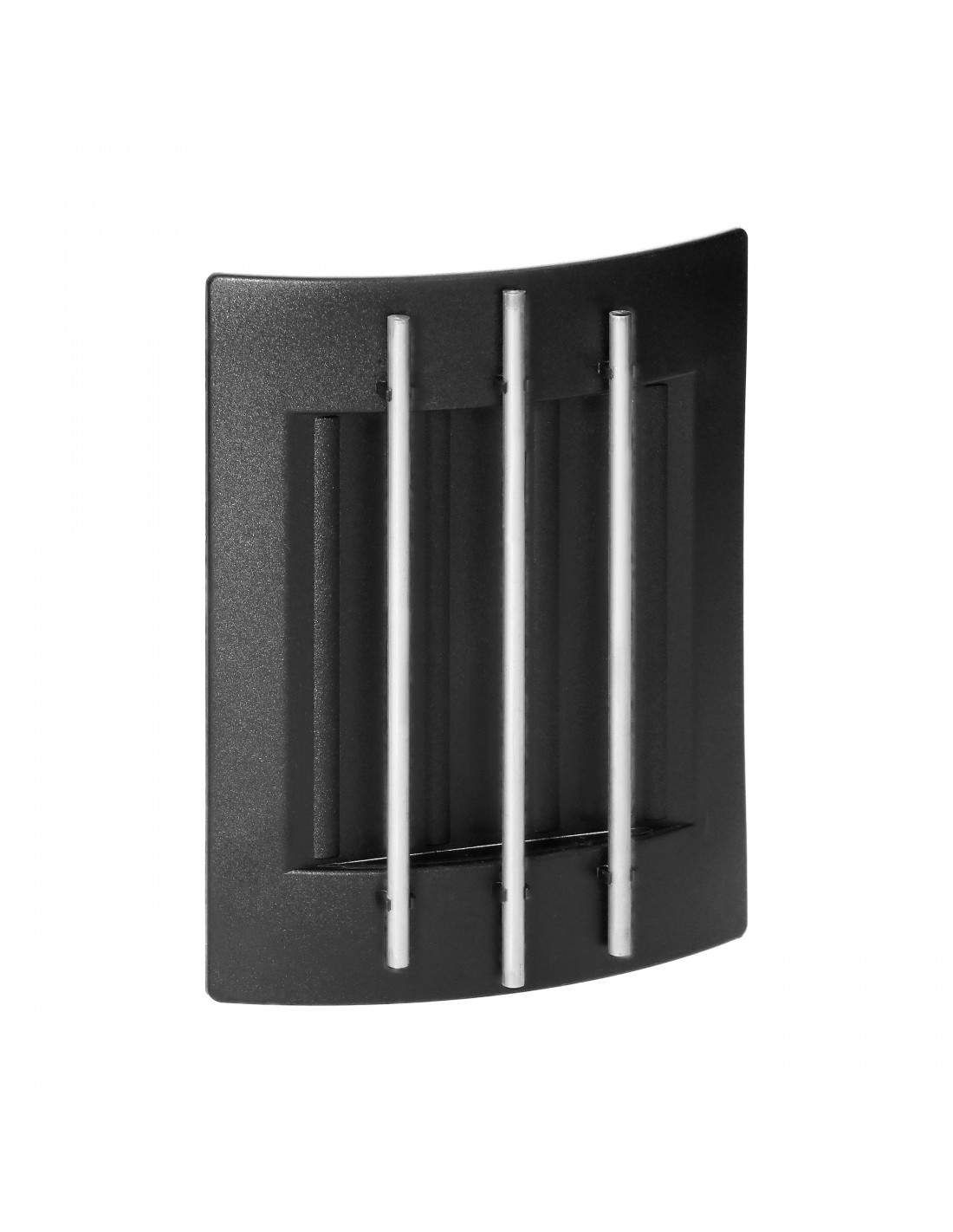 Przewodowy dzwonek elektromechaniczny zasilany przy zastosowaniu zewnętrznego transformatora 230/8V AC, dwa dźwięki BIM-BAM. Obudowa dzwonka jest czarna, a elementy dekoracyjne są w kolorze srebrnym.