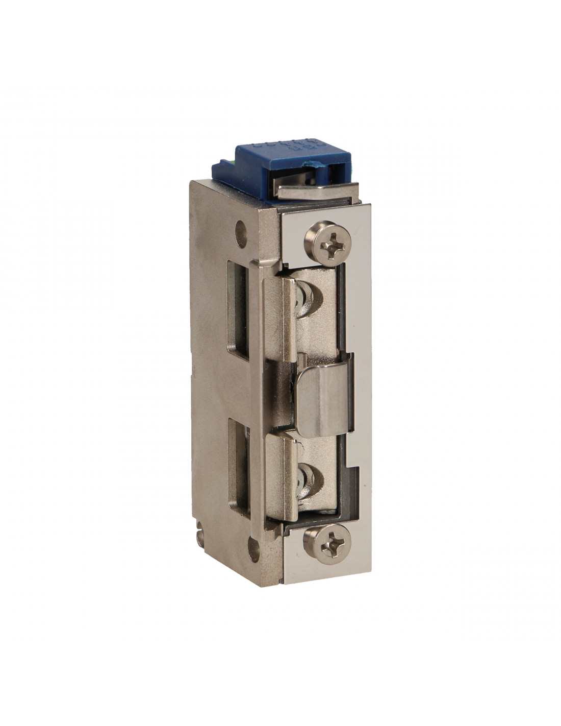 Elektrozaczep symetryczny, małogabarytowy wyposażony w dodatkową funkcję pamięci, która pozwala na sterowanie elektrozaczepem przez podanie krótkiego impulsu napięciowego. Po ustaniu impulsu stan otwarcia zaczepu podtrzymywany jest mechanicznie, aż do momentu otwarcia drzwi. Po zamknięciu drzwi zaczep samoczynnie się blokuje.
