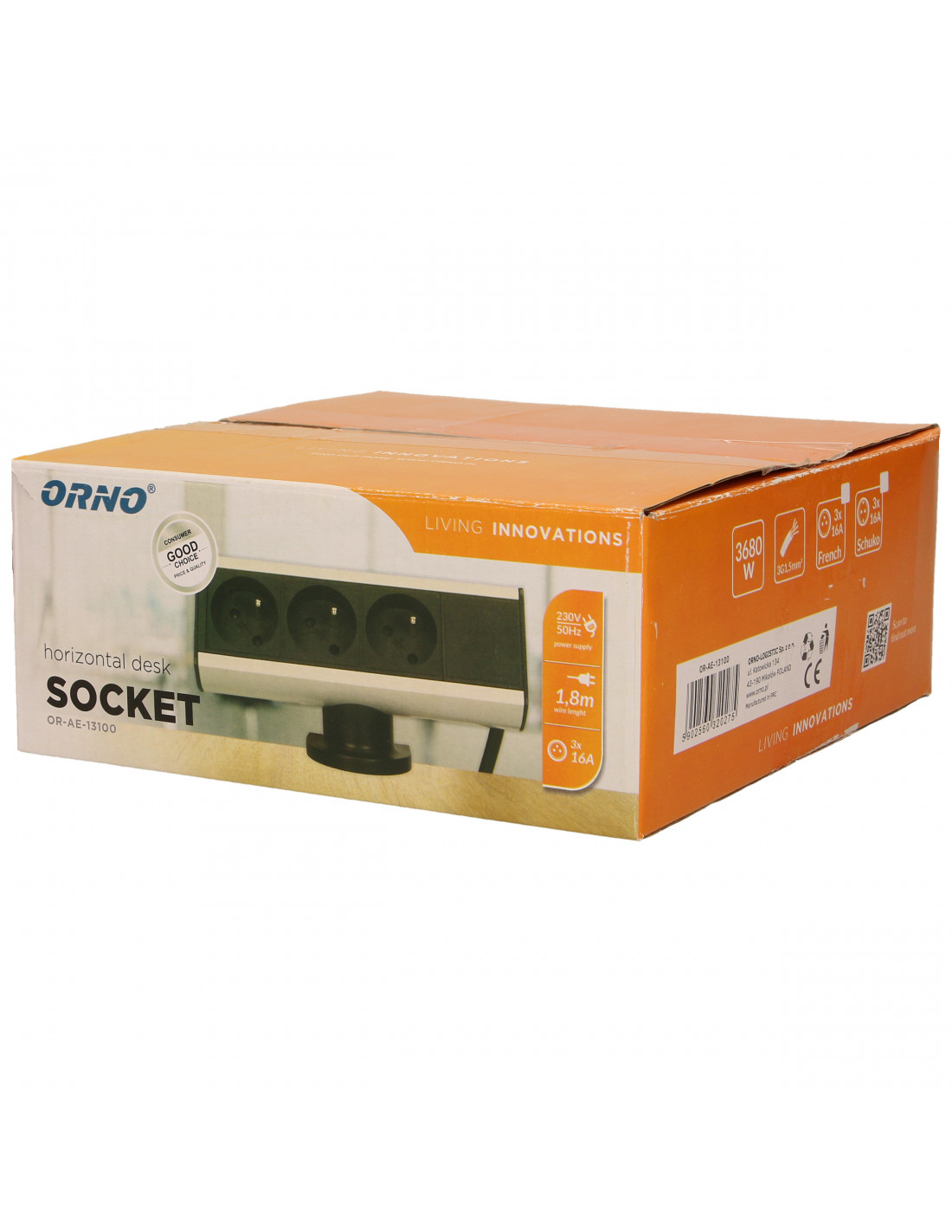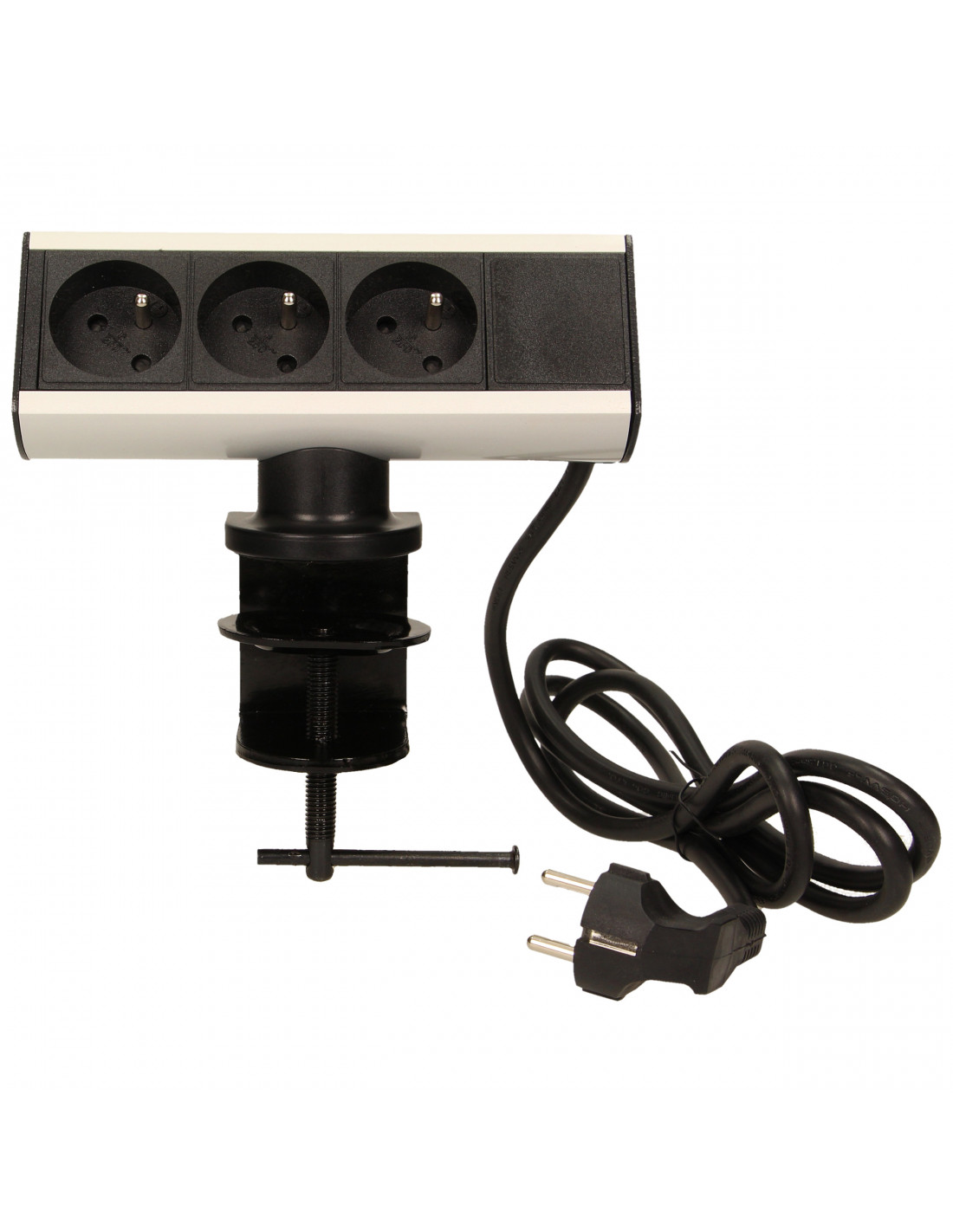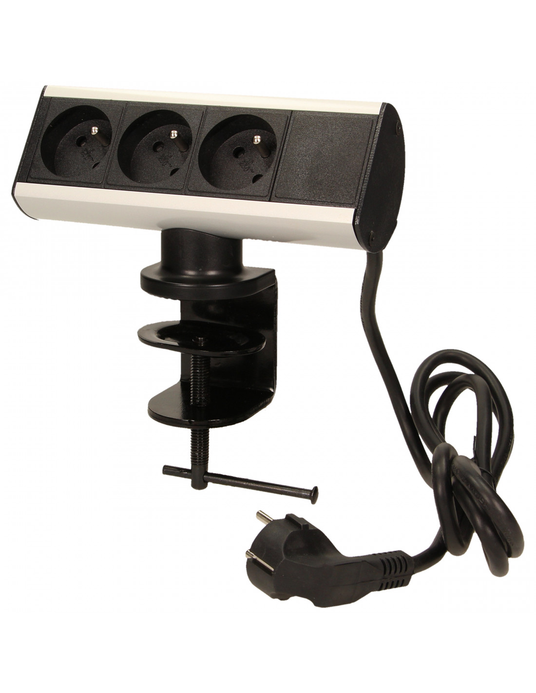 Zestaw gniazd sieciowych z uziemieniem i przesłonami torów prądowych, w metalowej obudowie wyposażonej w zacisk śrubowy, które umożliwiają przytwierdzenie podstawy gniazd do krawędzi blatu biurka lub półki bez konieczności wiercenia otworów montażowych. Wyposażone w przewód o długości 1,8 m.