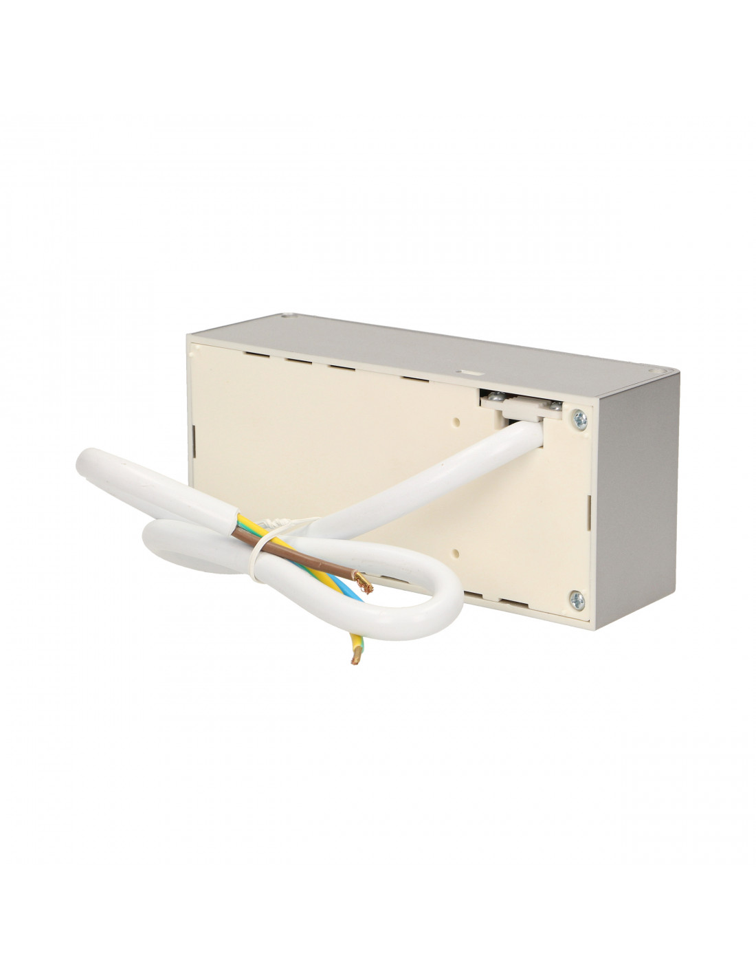 Zestaw dwóch gniazd sieciowych z uziemieniem i przesłonami torów prądowych, przeznaczone do montażu pod szafkami, w szafkach oraz witrynach.