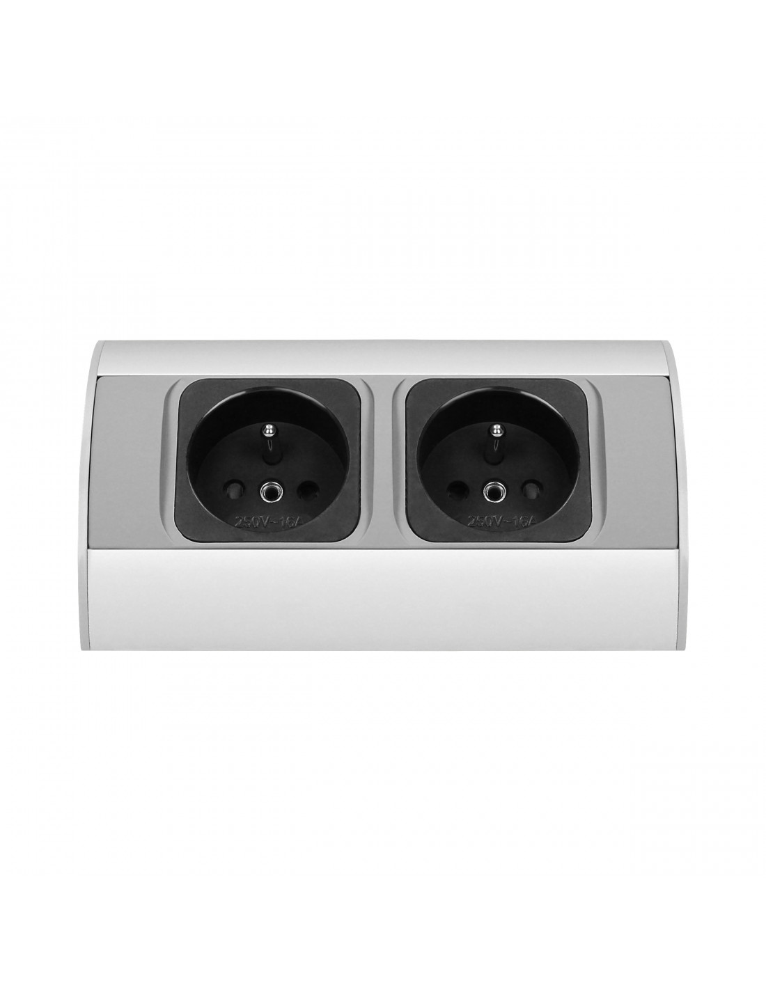 Zestaw dwóch gniazd sieciowych z uziemieniem i przesłonami torów prądowych, idealne, do montażu w szafkach, gablotach i witrynach.