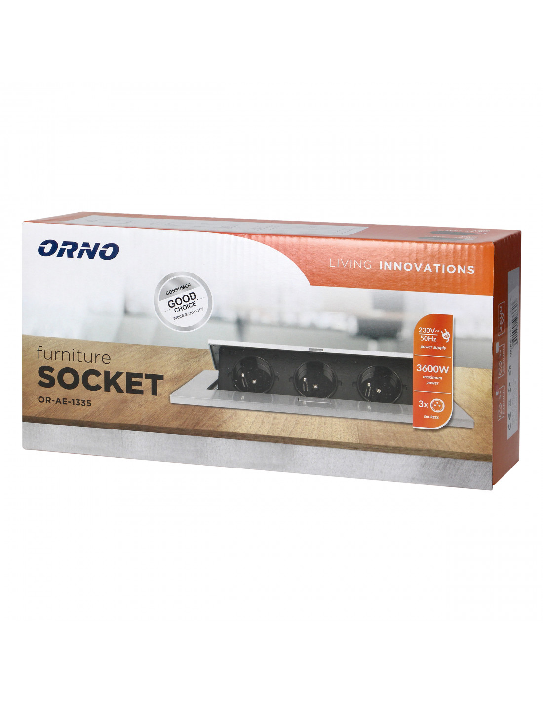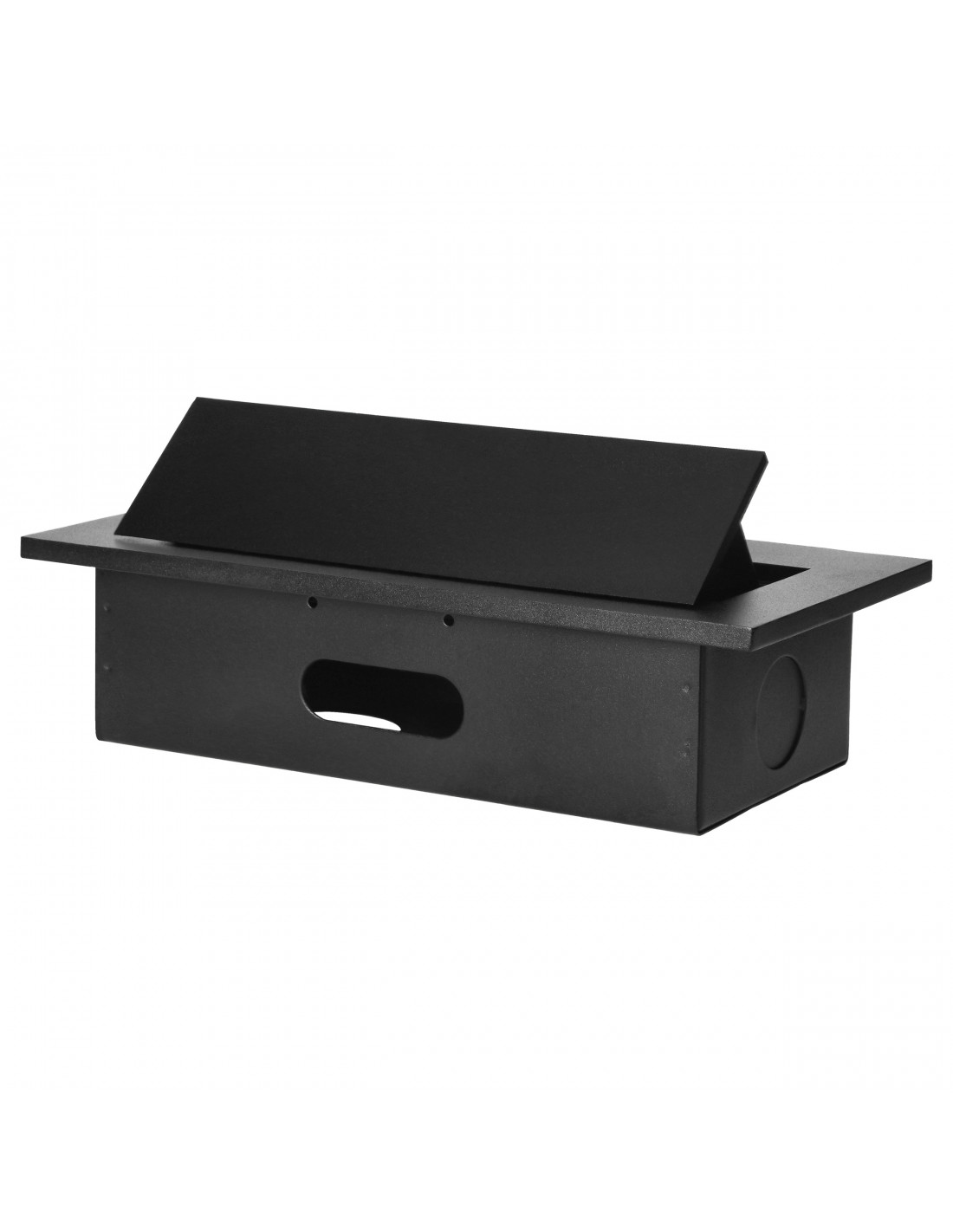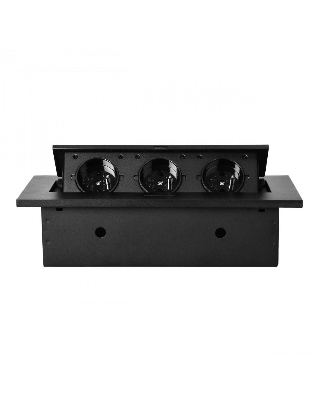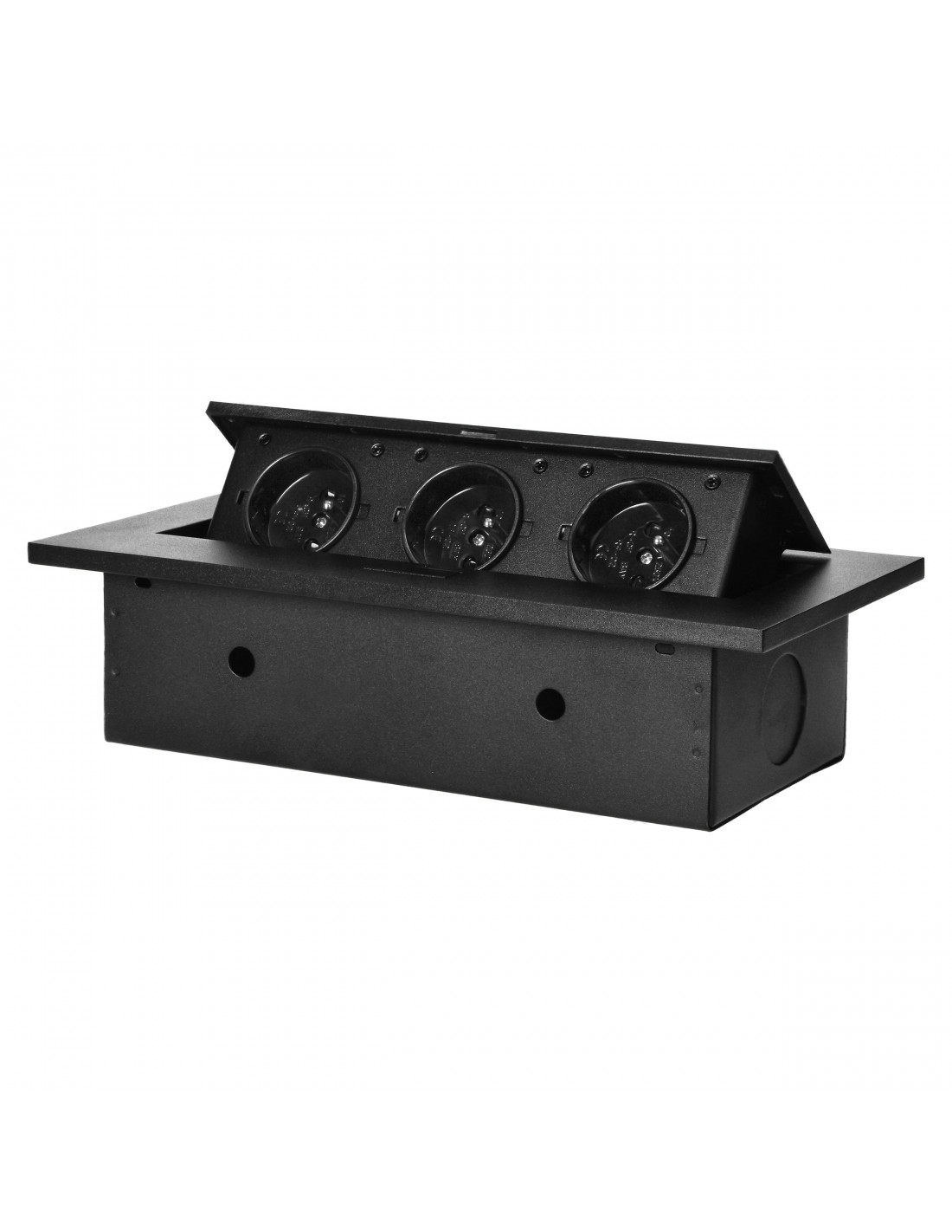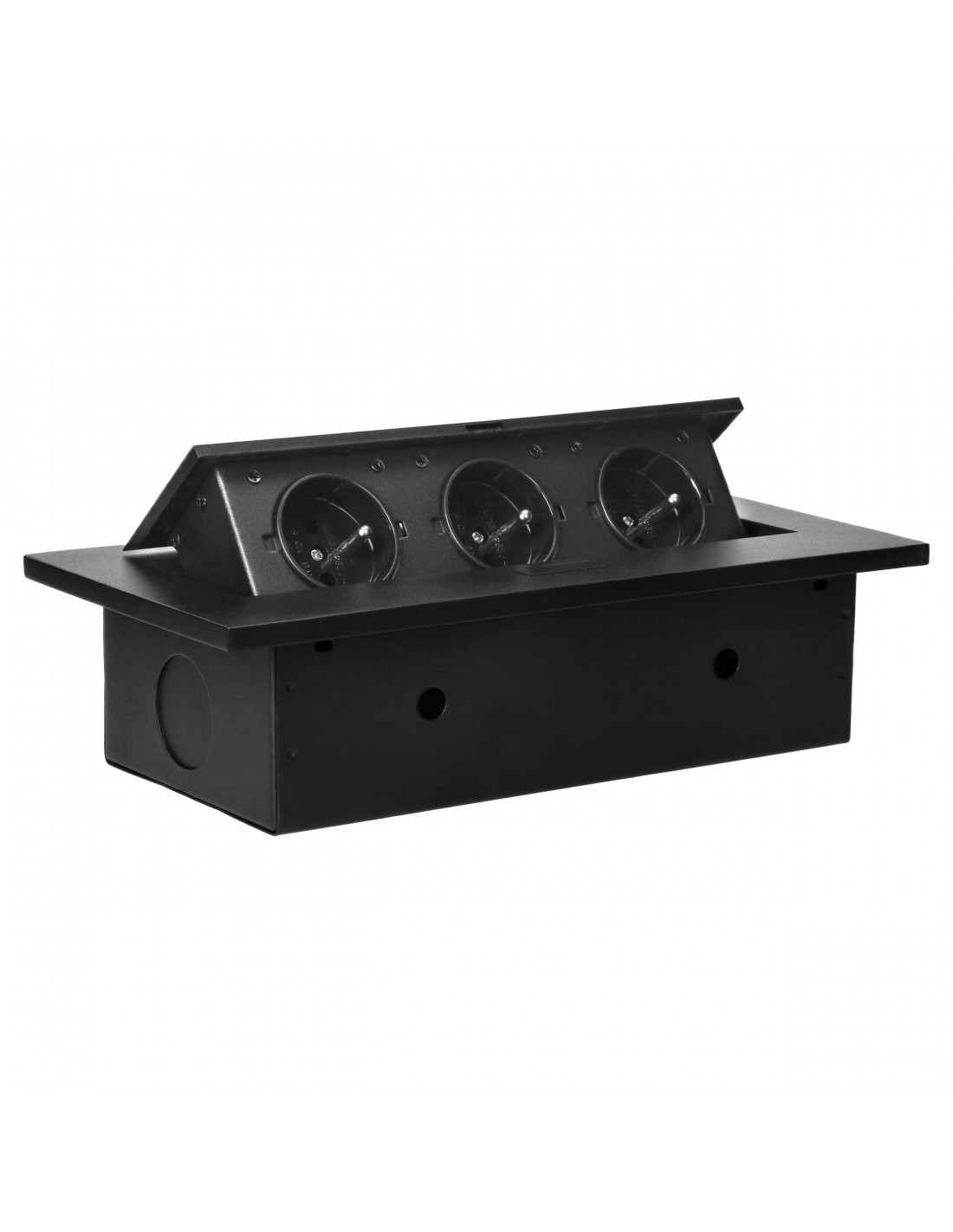 Zestaw trzech gniazd sieciowych z uziemieniem i przesłonami torów prądowych w obudowie chowanej w blat. Urządzenie przeznaczone jest do montażu w biurkach, blatach i stołach, może być zamontowane zarówno w pozycji pionowej jak i poziomej, zapewniając dostęp do gniazd elektrycznych. Zalecany przewód OWY 3 × 1,5mm² (brak w zestawie). Dostępne kolory: czarny, srebrny.