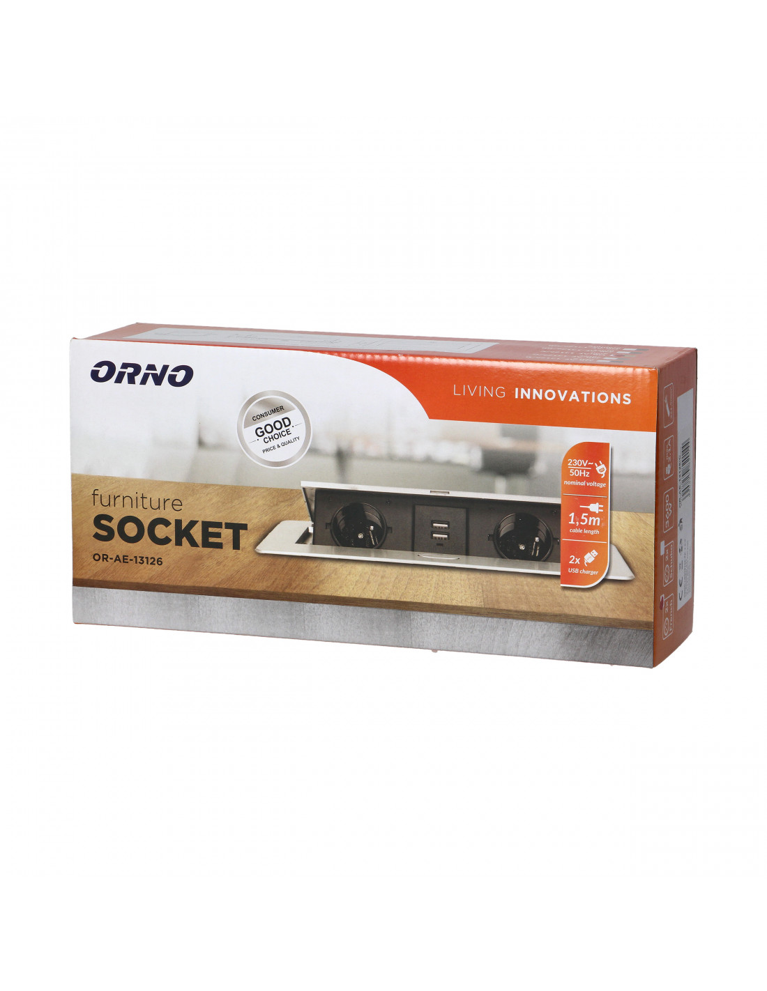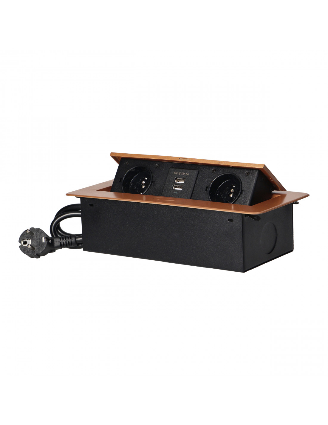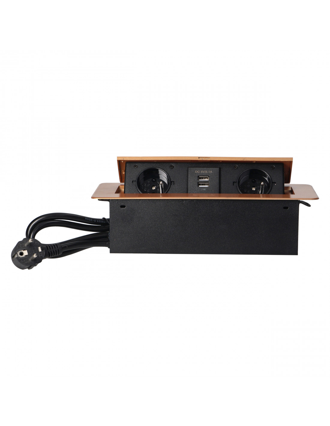 Zestaw dwóch gniazd sieciowych z uziemieniem i przesłonami torów prądowych, połączonych z ładowarką USB w obudowie chowanej w blat. Urządzenie przeznaczone jest do montażu w biurkach, blatach i stołach, może być zamontowane zarówno w pozycji pionowej jak i poziomej, zapewniając wygodny dostęp do gniazd elektrycznych. Dzięki płaskiemu rantowi (zaledwie 2 mm) obudowa z gniazdami doskonale wpasowuje się w płaszczyznę np. stołu i nie przeszkadza w jego czyszczeniu. Zestaw posiada fabrycznie zamontowany kabel o długości 1,5m. Kolor: złoty.