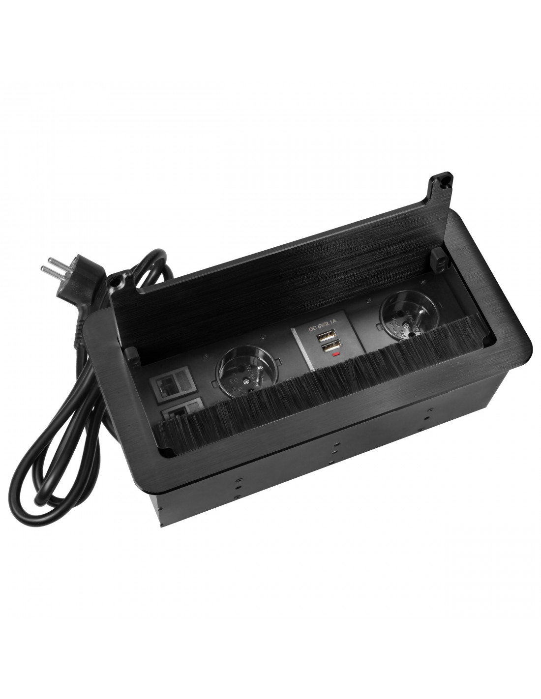 Zestaw dwóch gniazd sieciowych z uziemieniem i przesłonami torów prądowych, połączonych z 2 gniazdami USB wyposażonymi w ładowarkę oraz 2 gniazdami network w obudowie chowanej w blat. Urządzenie przeznaczone jest do montażu w biurkach, blatach i stołach. Zamykana obudowa gniazd posiada udoskonaloną konstrukcję, a szczelina wykończona jest szczotką przeciwkurzową, która zapobiega dostawaniu się wszelkich drobinek do środka urządzenia. Taki zestaw sprawdzi się doskonale w biurach, salach konferencyjnych, jak również w pokoju studenta. Przewód ma długość 1,5 m.