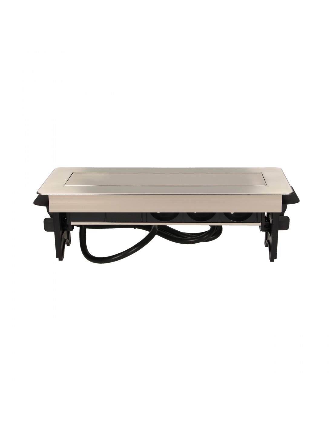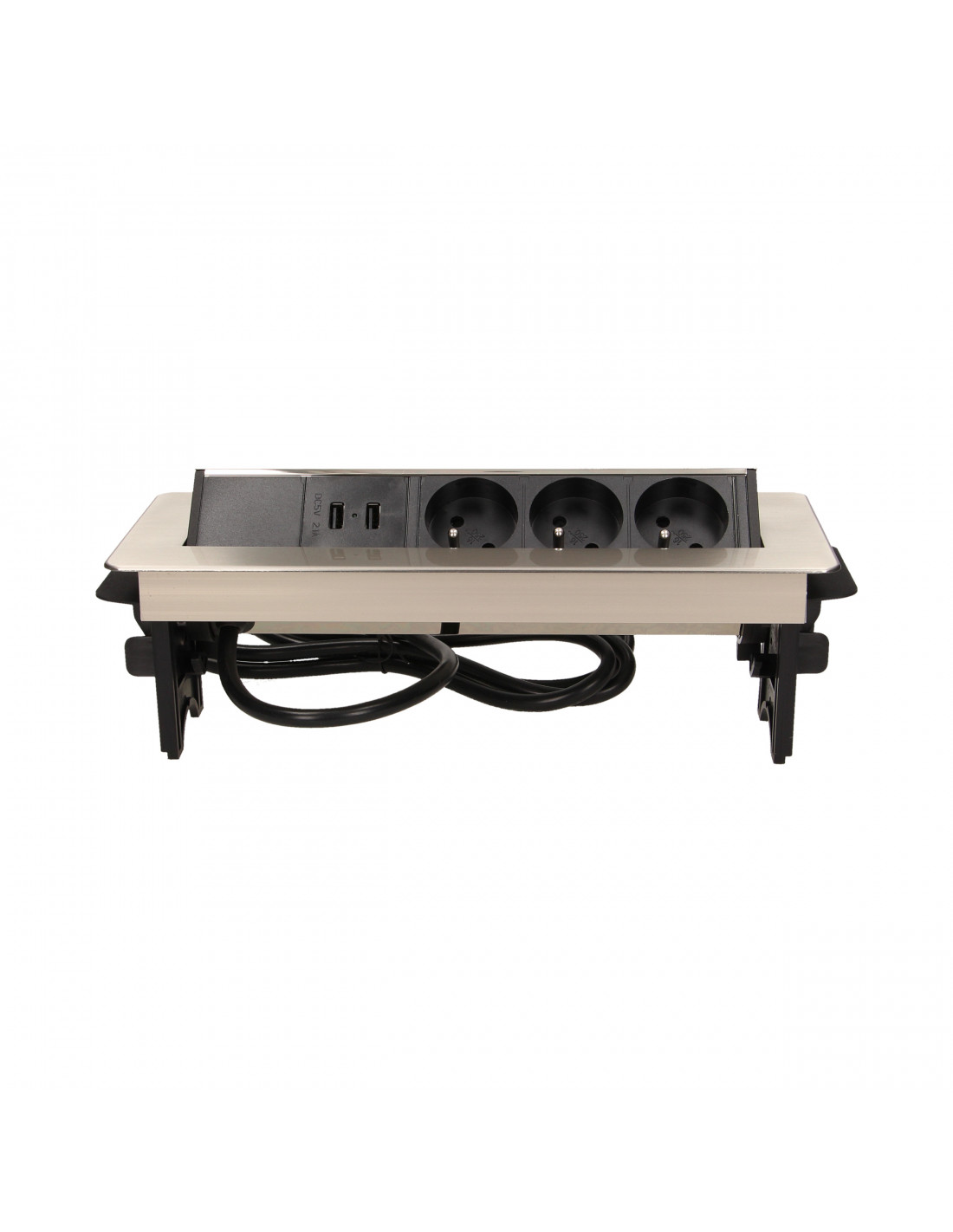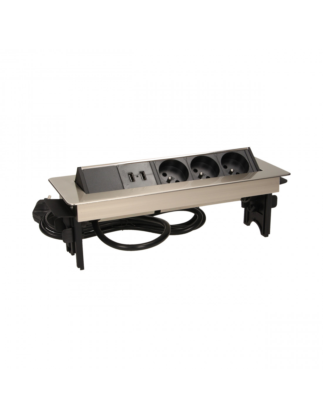Zestaw trzech gniazd sieciowych z uziemieniem i przesłonami torów prądowych, połączonych z ładowarką USB w niklowanej obudowie chowanej w blacie biurka lub stołu. Połączenie nowoczesnej konstrukcji z wysoką jakością wykonania sprawia, że produkt idealnie nadaje się do zastosowania w biurze, sali konferencyjnej, gabinecie, warsztacie, a także w domu. Posiada zamykany panel z gniazdami oraz przewód o długości 1,8 m.