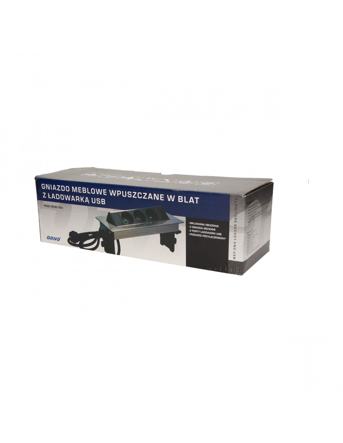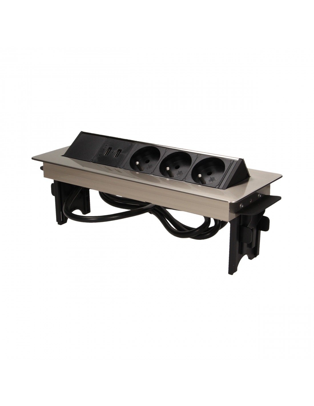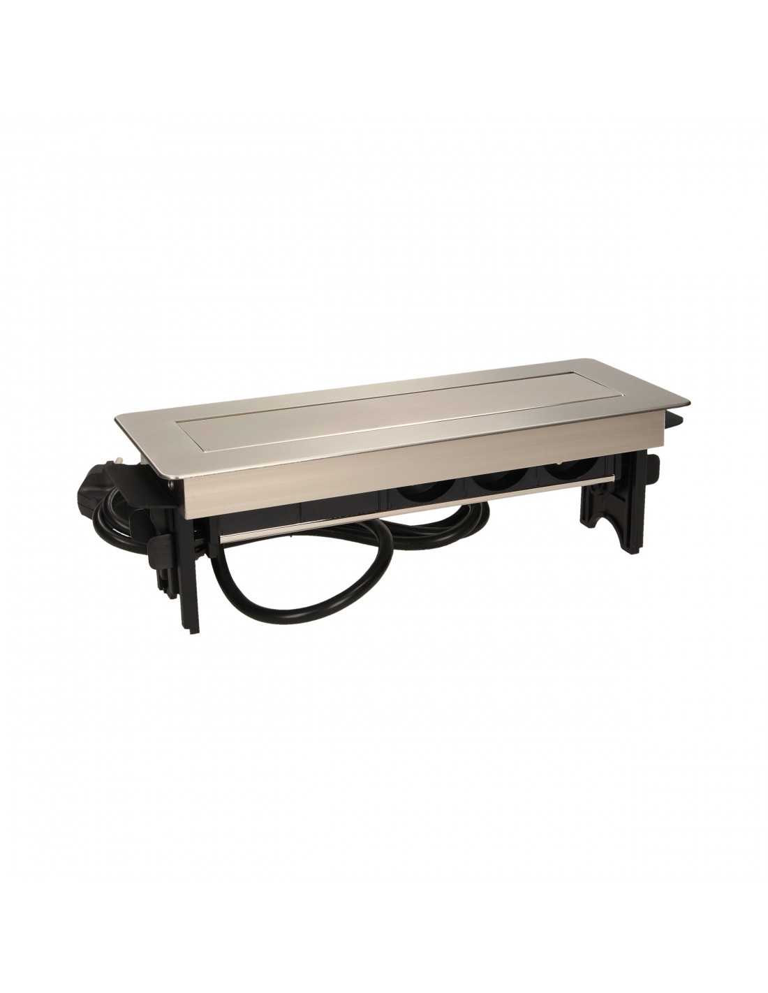 Zestaw trzech gniazd sieciowych z uziemieniem i przesłonami torów prądowych, połączonych z ładowarką USB w niklowanej obudowie chowanej w blacie biurka lub stołu. Połączenie nowoczesnej konstrukcji z wysoką jakością wykonania sprawia, że produkt idealnie nadaje się do zastosowania w biurze, sali konferencyjnej, gabinecie, warsztacie, a także w domu. Posiada zamykany panel z gniazdami oraz przewód o długości 1,8 m.