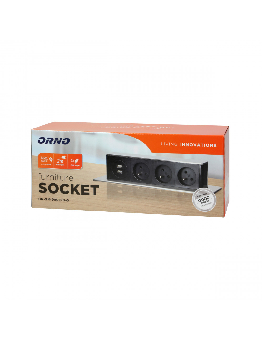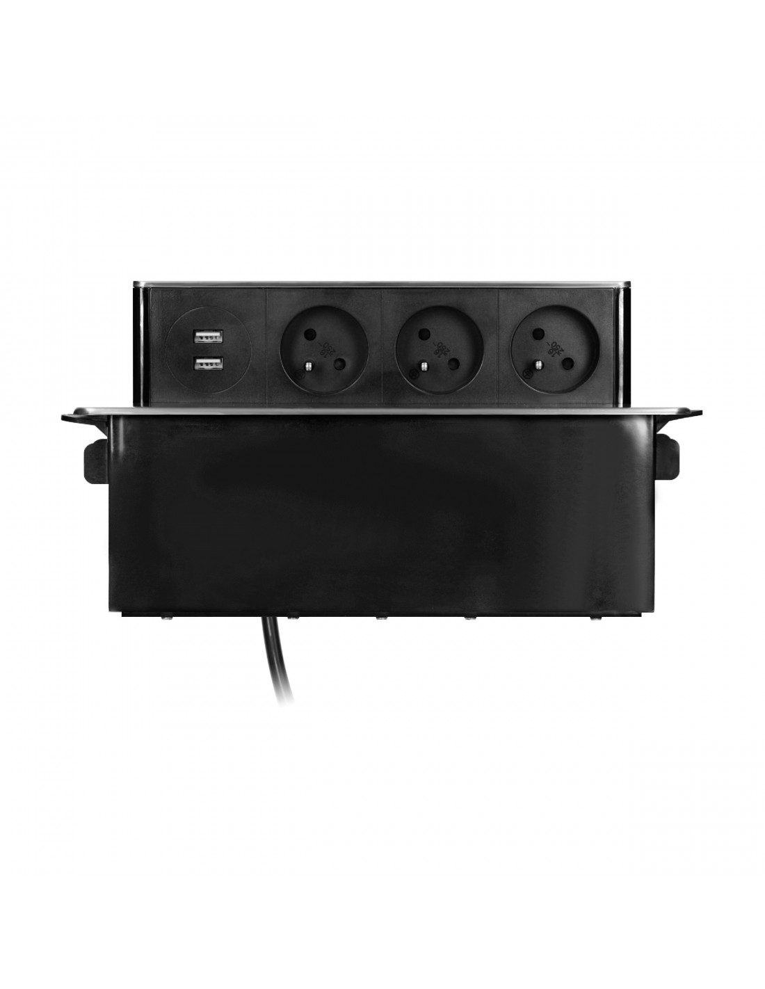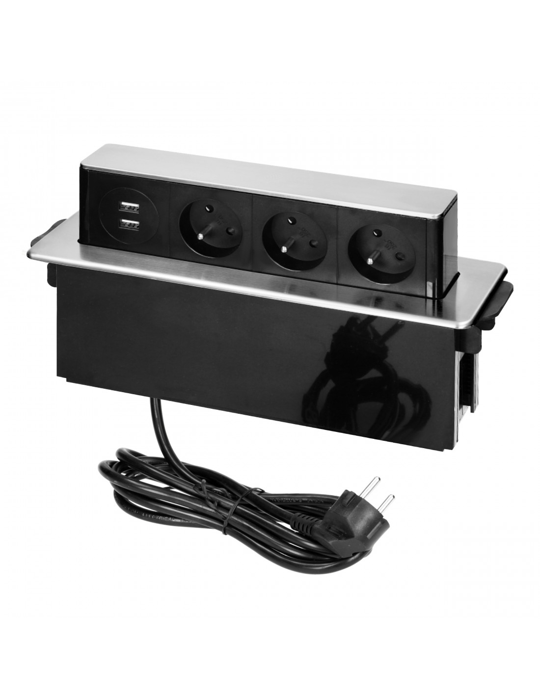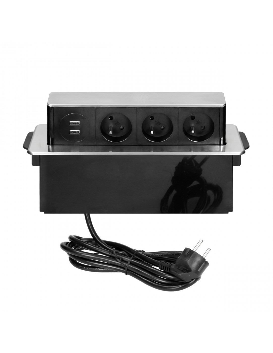 Elegancka obudowa z panelem ze stali nierdzewnej INOX, zawierająca zestaw trzech uziemionych gniazd sieciowych typu E oraz 2 wejść USB. Nadaje się do montażu w stołach konferencyjnych, blatach mebli biurowych i kuchennych. Obudowa jest schowana w blacie, a dzięki płaskiemu, frezowanemu rantowi jest niemal niewidoczna. Panel z gniazdami wysuwamy wtedy, gdy chcemy podłączyć zewnętrzny sprzęt. Posiada przewód o długości 2m.