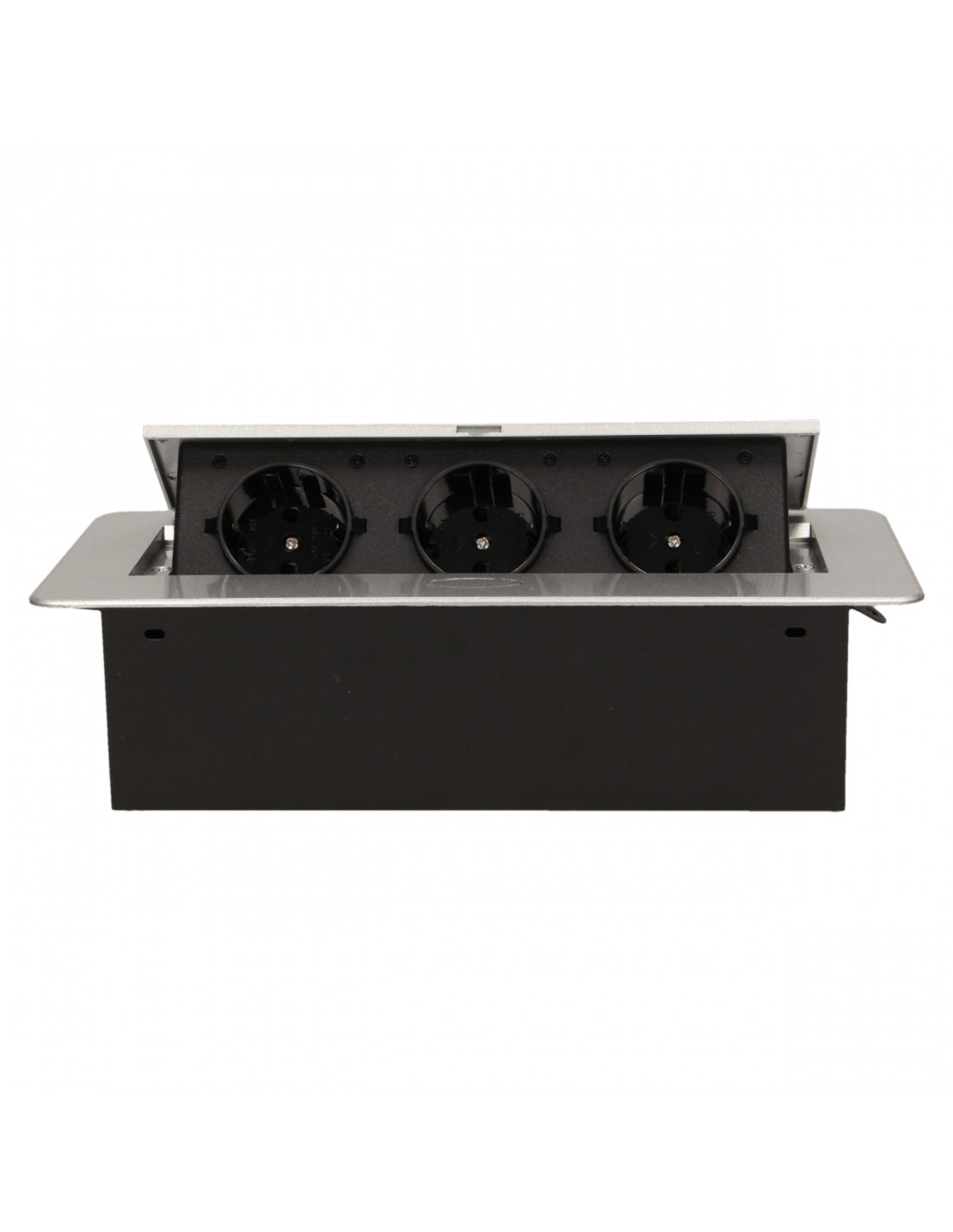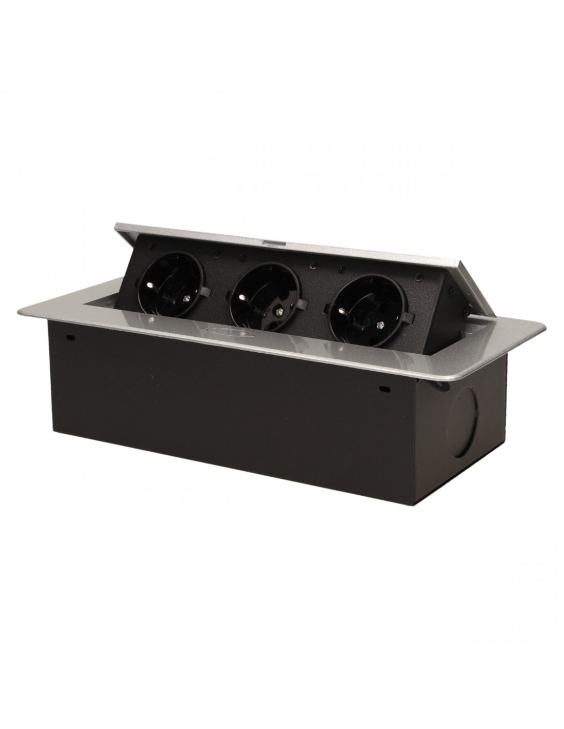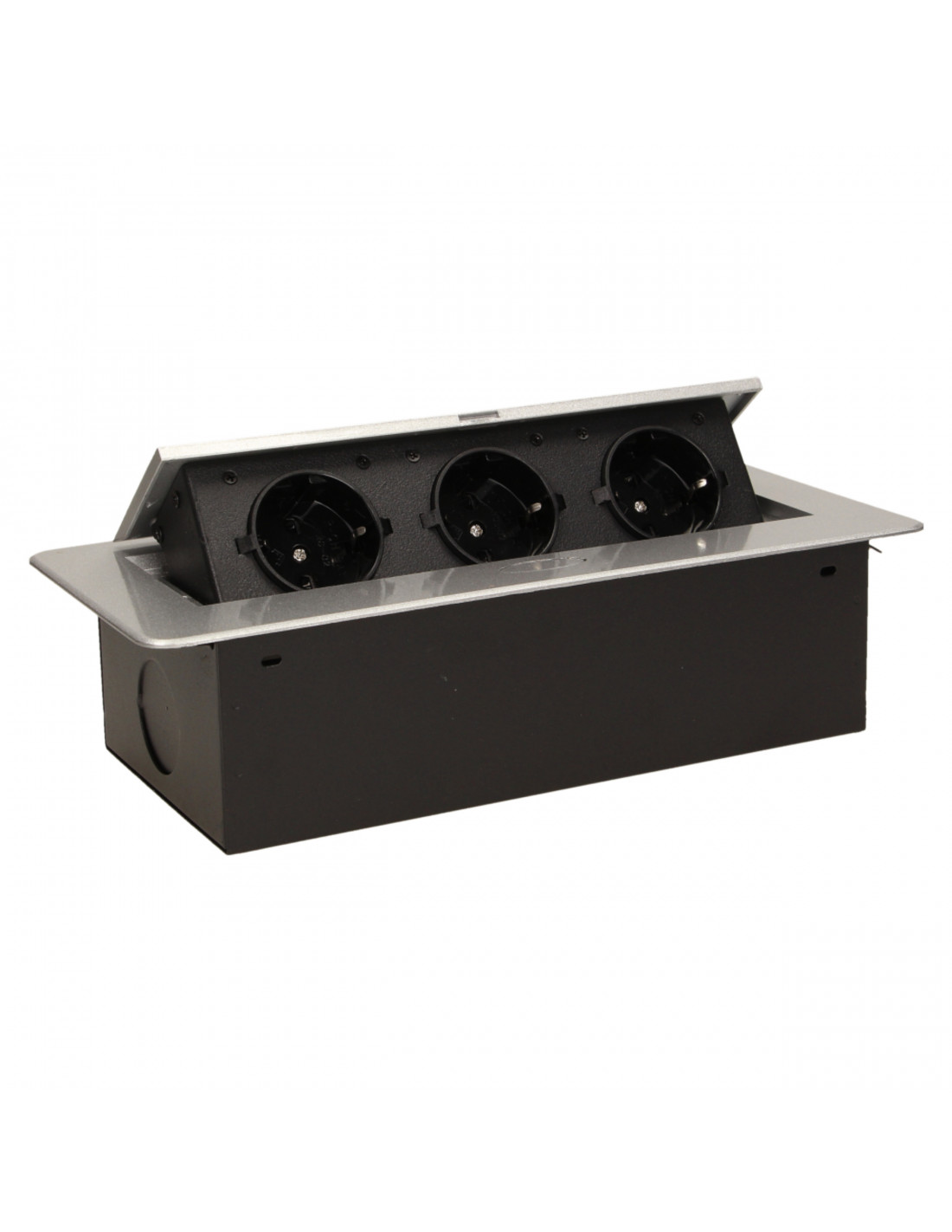 Zestaw trzech gniazd sieciowych z uziemieniem i przesłonami torów prądowych w obudowie chowanej w blat. Urządzenie przeznaczone jest do montażu w biurkach, blatach i stołach, może być zamontowane zarówno w pozycji pionowej jak i poziomej, zapewniając dostęp do gniazd elektrycznych. Zalecany przewód OWY 3 × 1,5 mm² (brak w zestawie). Dostępne kolory: czarny, srebrny, złoty, mosiądz, grafit.
