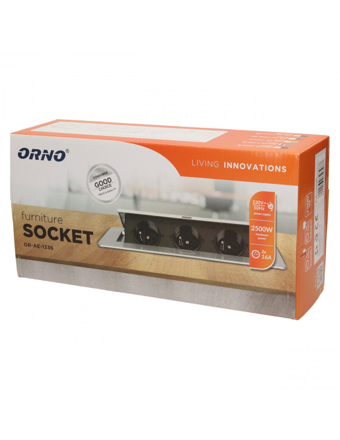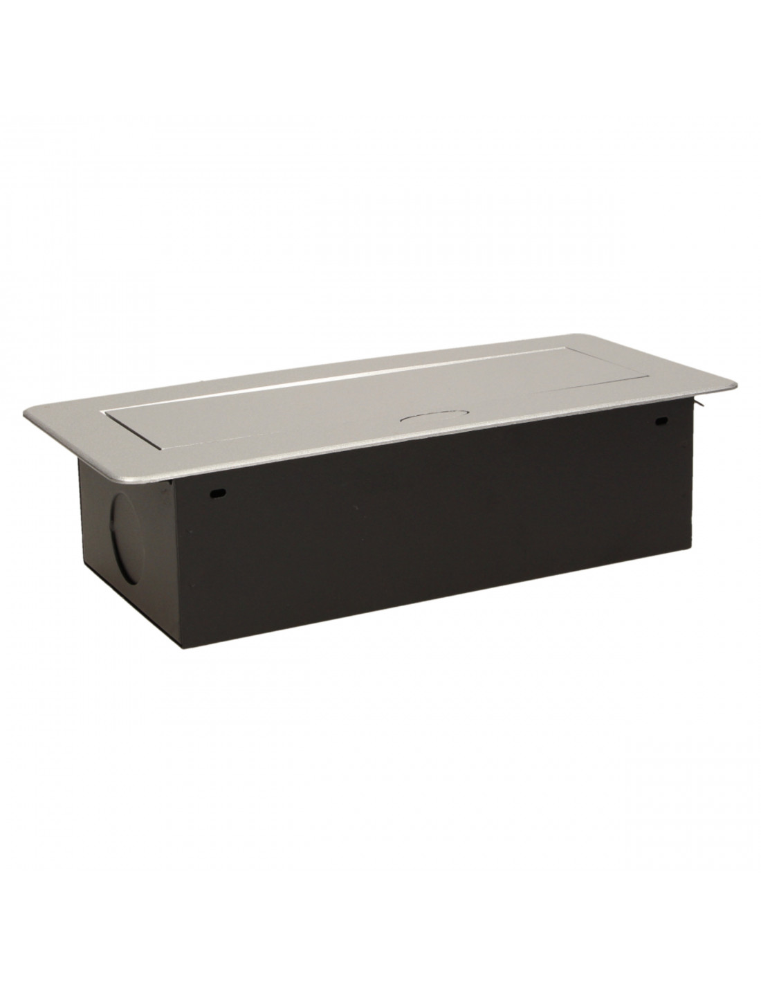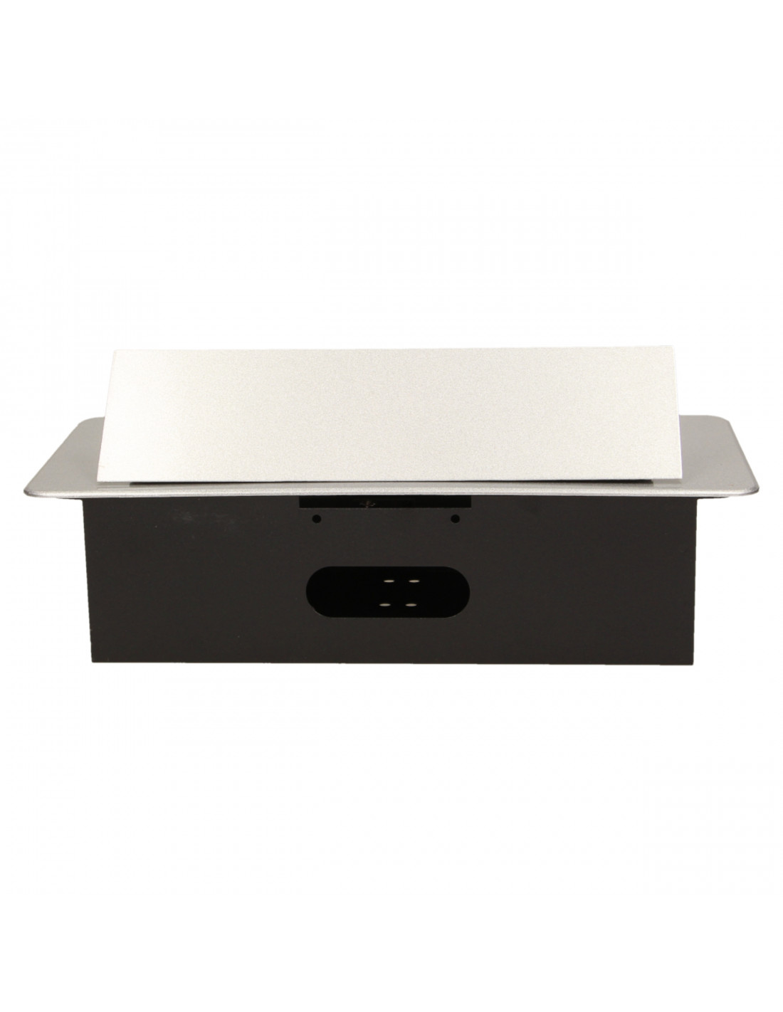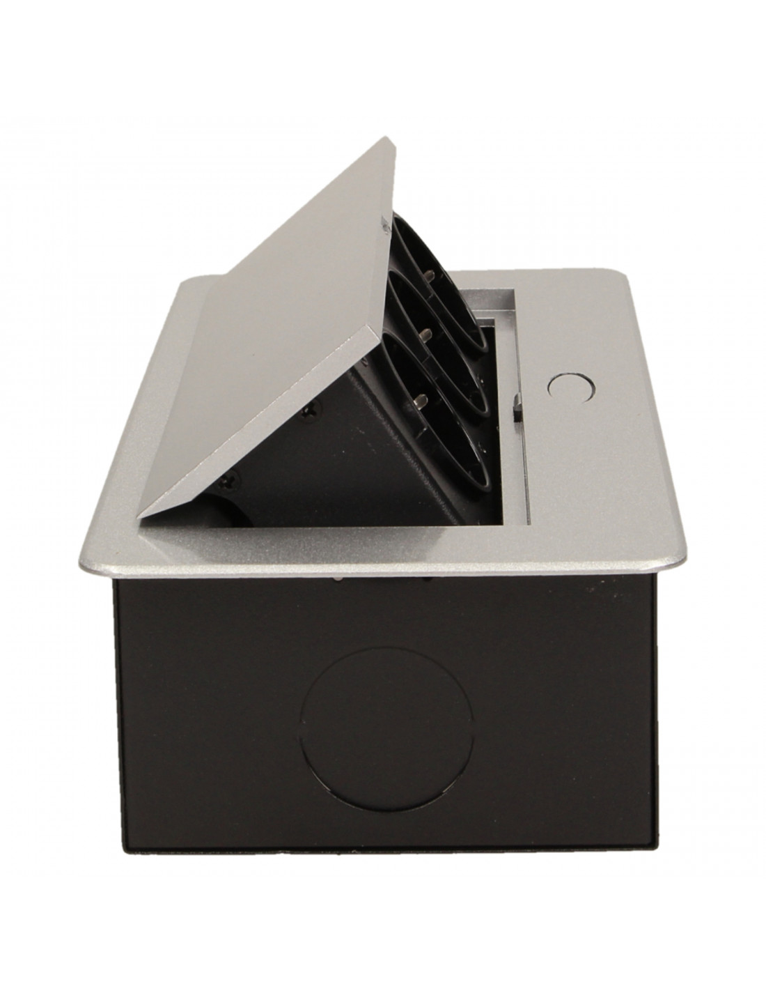 Zestaw trzech gniazd sieciowych z uziemieniem i przesłonami torów prądowych w obudowie chowanej w blat. Urządzenie przeznaczone jest do montażu w biurkach, blatach i stołach, może być zamontowane zarówno w pozycji pionowej jak i poziomej, zapewniając dostęp do gniazd elektrycznych. Zalecany przewód OWY 3 × 1,5 mm² (brak w zestawie). Dostępne kolory: czarny, srebrny, złoty, mosiądz, grafit.