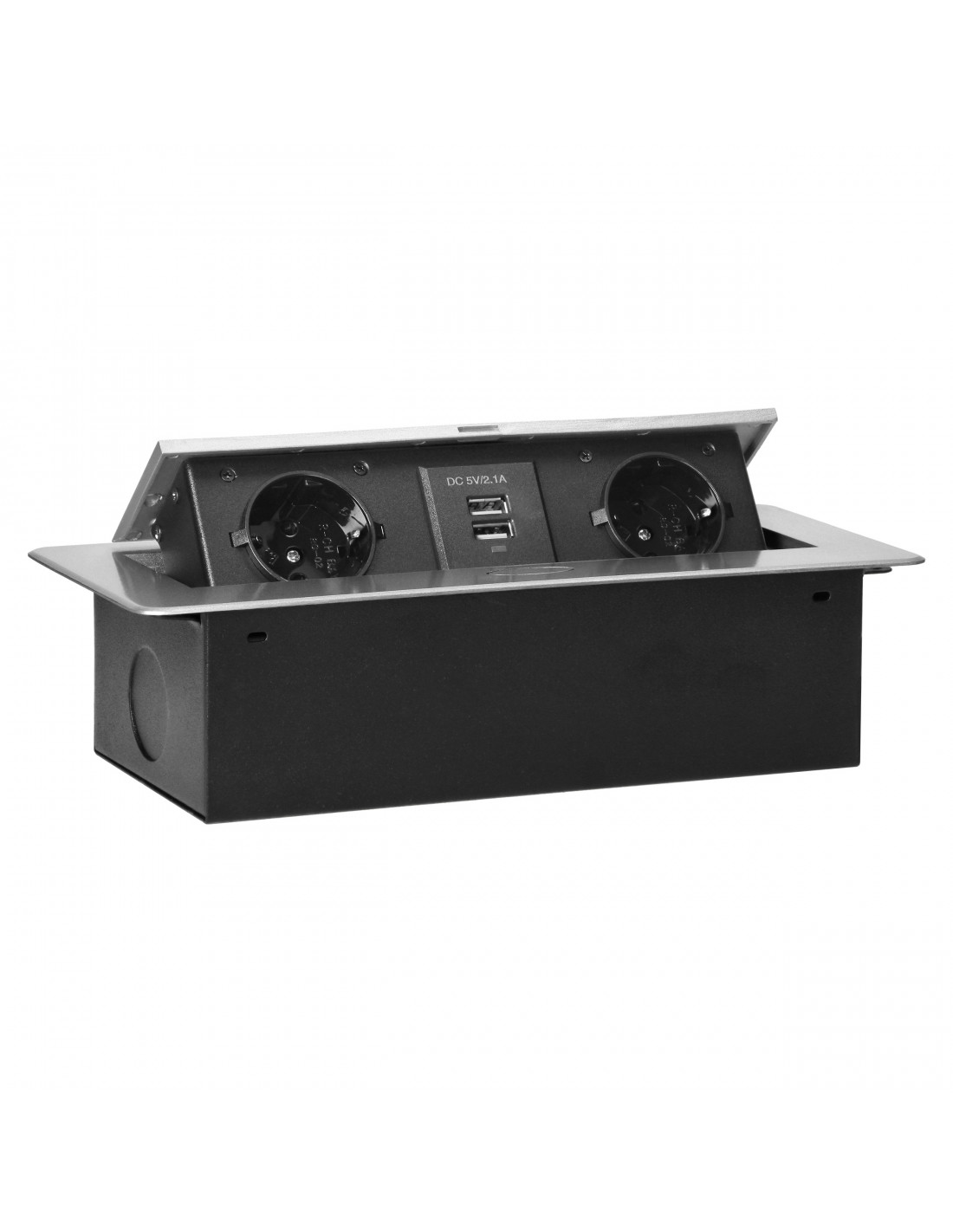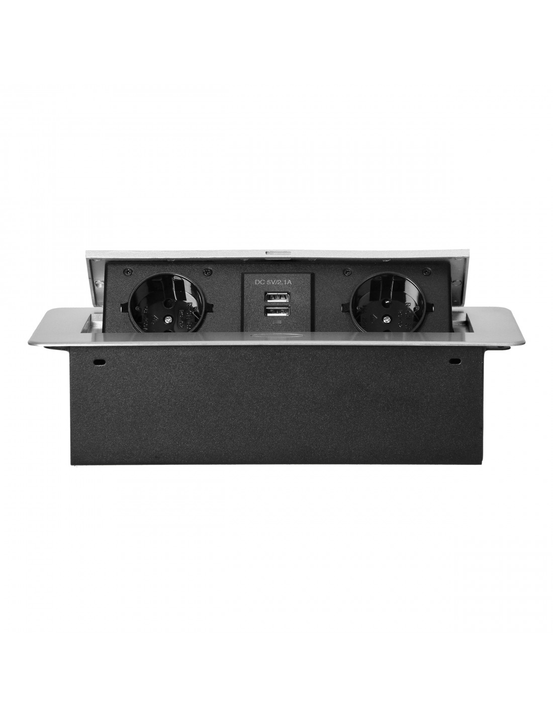 Zestaw dwóch gniazd sieciowych z uziemieniem Schuko i przesłonami torów prądowych, połączonych z ładowarką USB w obudowie chowanej w blat. Urządzenie przeznaczone jest do montażu w biurkach, blatach i stołach, może być zamontowane zarówno w pozycji pionowej jak i poziomej zapewniając wygodny dostęp do gniazd elektrycznych. Dzięki płaskiemu rantowi (zaledwie 2 mm) obudowa z gniazdami doskonale wpasowuje się w płaszczyznę np. stołu i nie przeszkadza w jego czyszczeniu. Zalecany przewód OWY 3 × 1,5 mm² (brak w zestawie). Kolor: srebrny.
