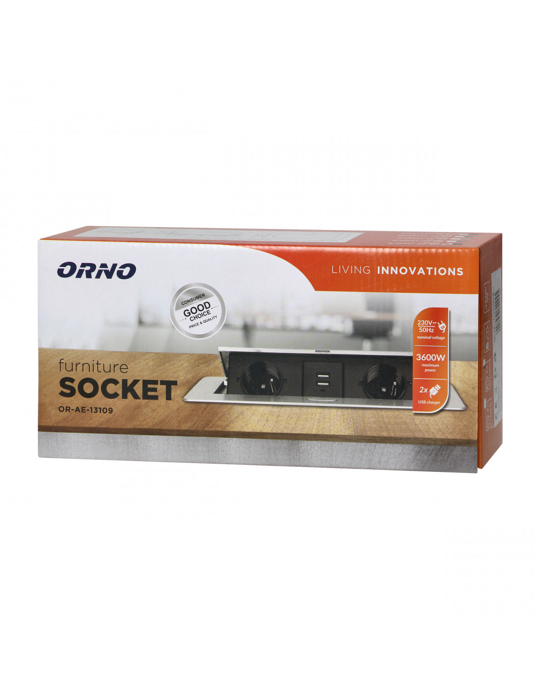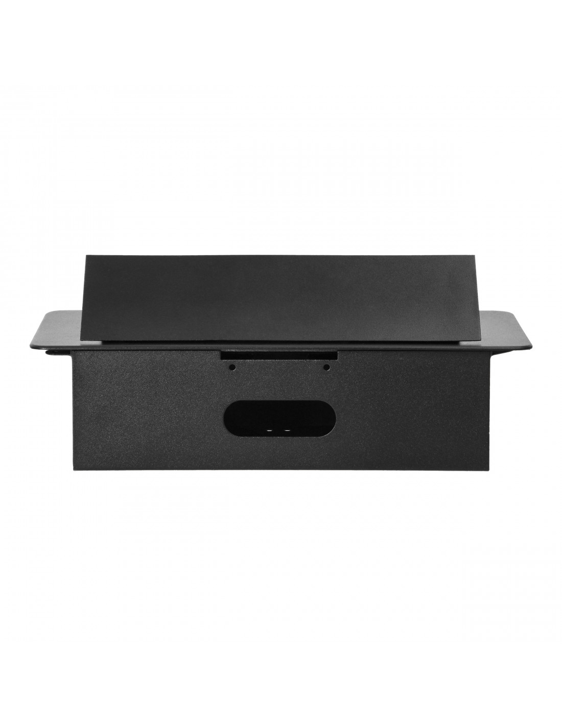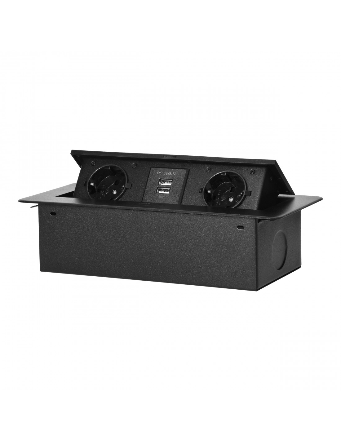Zestaw dwóch gniazd sieciowych z uziemieniem Schuko i przesłonami torów prądowych, połączonych z ładowarką USB w obudowie chowanej w blat. Urządzenie przeznaczone jest do montażu w biurkach, blatach i stołach, może być zamontowane zarówno w pozycji pionowej jak i poziomej zapewniając wygodny dostęp do gniazd elektrycznych. Dzięki płaskiemu rantowi (zaledwie 2 mm) obudowa z gniazdami doskonale wpasowuje się w płaszczyznę np. stołu i nie przeszkadza w jego czyszczeniu. Zalecany przewód OWY 3 × 1,5 mm² (brak w zestawie). Kolor: czarny.