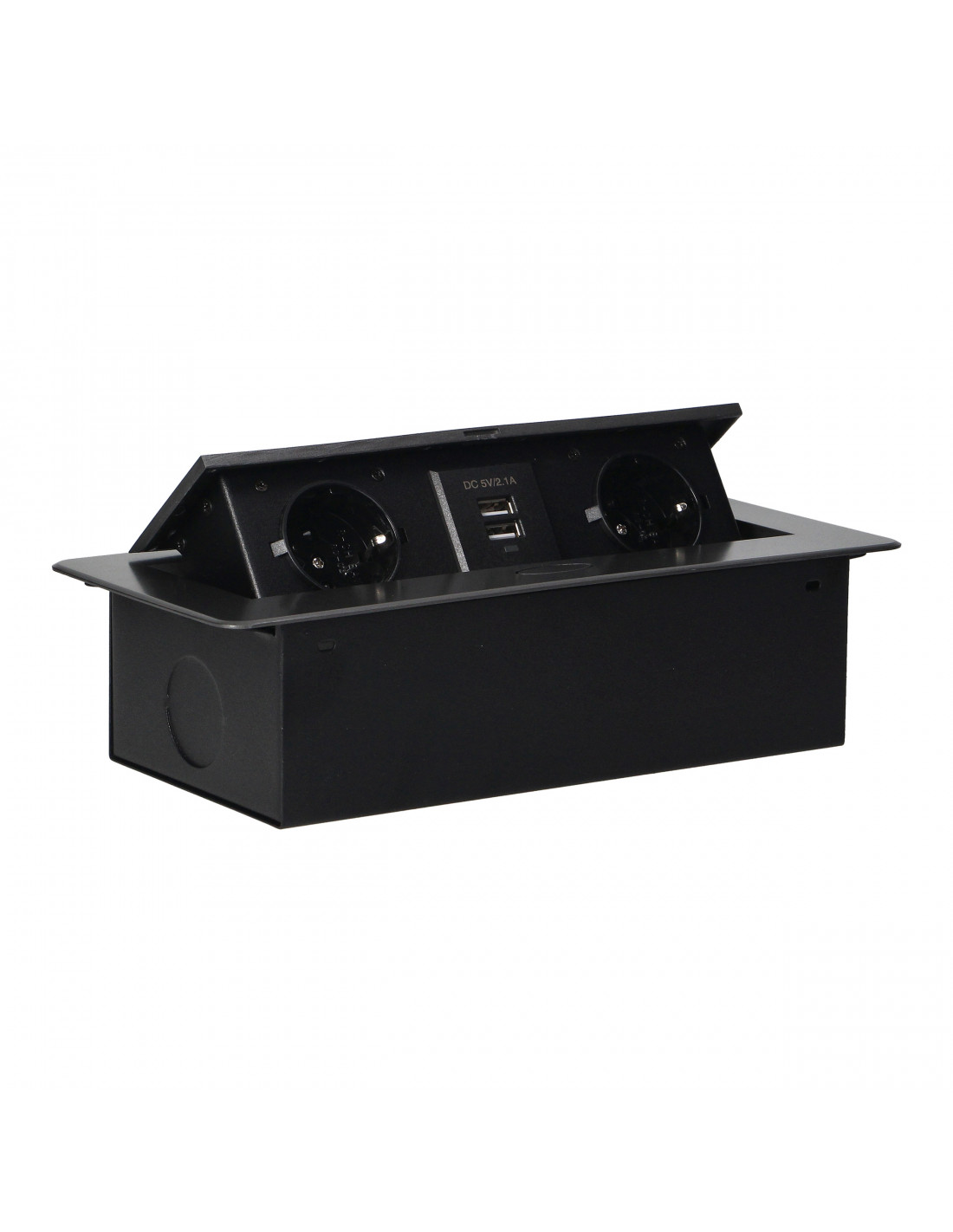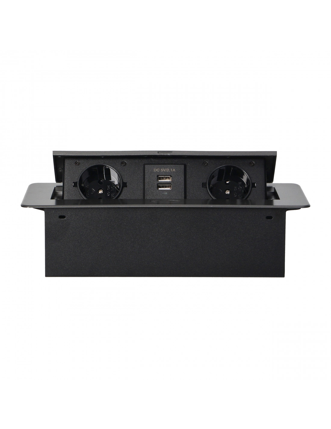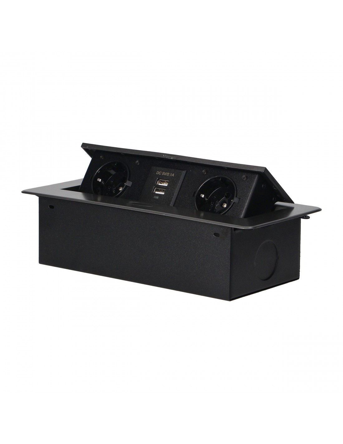 Zestaw dwóch gniazd sieciowych z uziemieniem Schuko i przesłonami torów prądowych, połączonych z ładowarką USB w obudowie chowanej w blat. Urządzenie przeznaczone jest do montażu w biurkach, blatach i stołach, może być zamontowane zarówno w pozycji pionowej jak i poziomej zapewniając wygodny dostęp do gniazd elektrycznych. Dzięki płaskiemu rantowi (zaledwie 2 mm) obudowa z gniazdami doskonale wpasowuje się w płaszczyznę np. stołu i nie przeszkadza w jego czyszczeniu. Zalecany przewód OWY 3 × 1,5 mm² (brak w zestawie). Kolor: grafit.