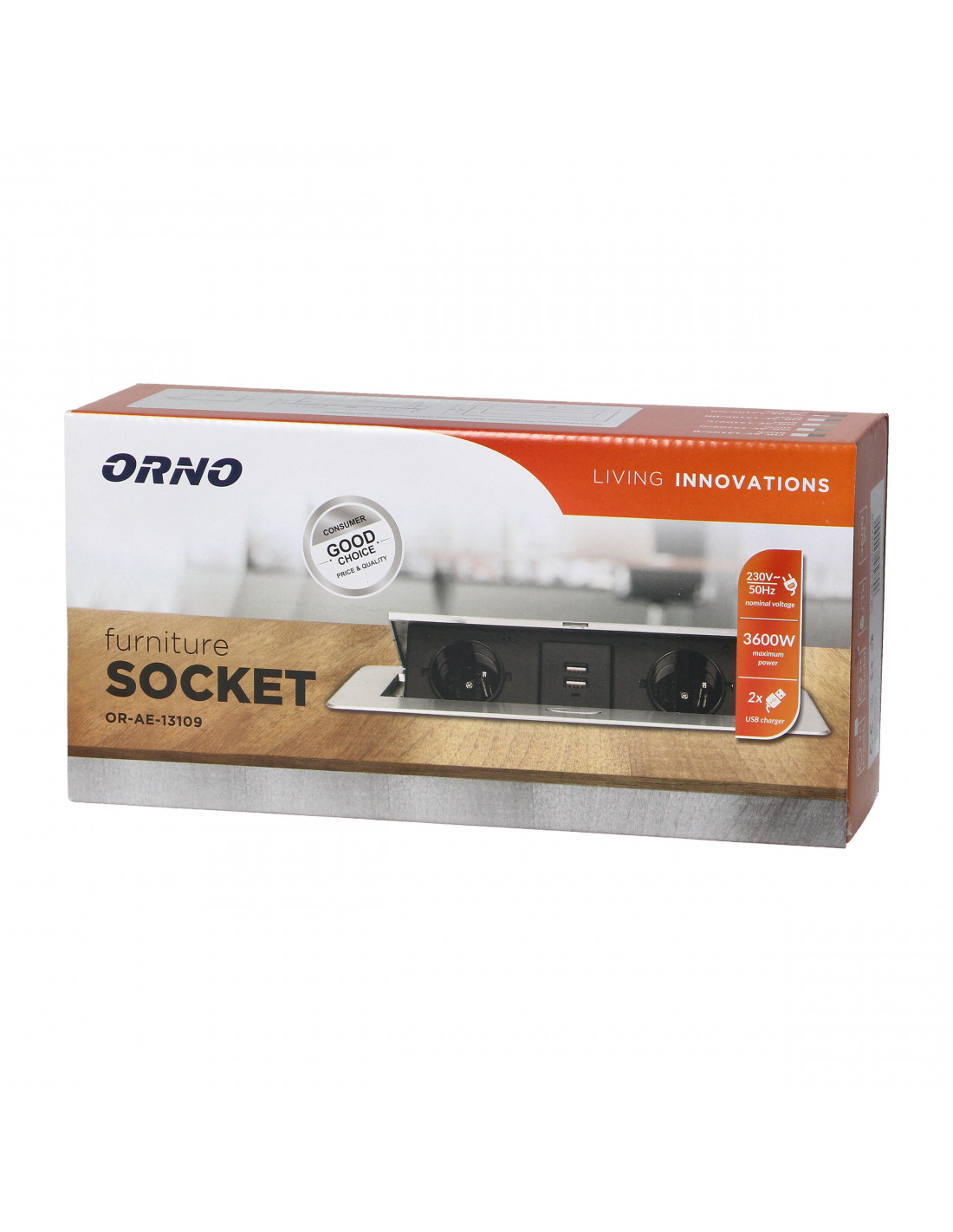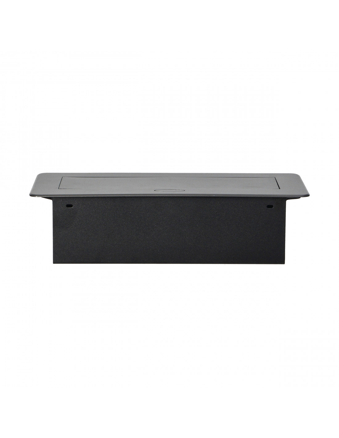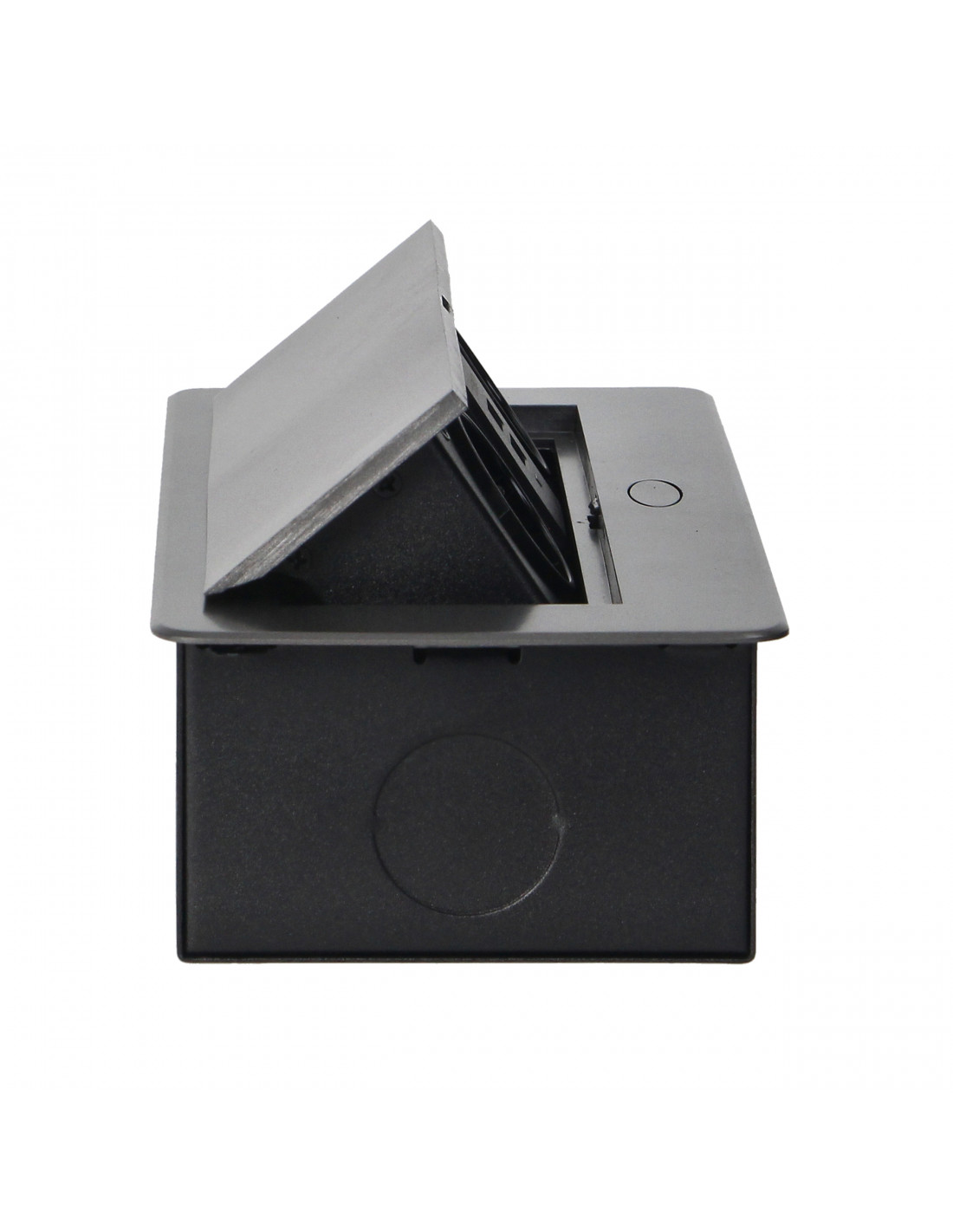 Zestaw dwóch gniazd sieciowych z uziemieniem Schuko i przesłonami torów prądowych, połączonych z ładowarką USB w obudowie chowanej w blat. Urządzenie przeznaczone jest do montażu w biurkach, blatach i stołach, może być zamontowane zarówno w pozycji pionowej jak i poziomej zapewniając wygodny dostęp do gniazd elektrycznych. Dzięki płaskiemu rantowi (zaledwie 2 mm) obudowa z gniazdami doskonale wpasowuje się w płaszczyznę np. stołu i nie przeszkadza w jego czyszczeniu. Zalecany przewód OWY 3 × 1,5 mm² (brak w zestawie). Kolor: grafit.