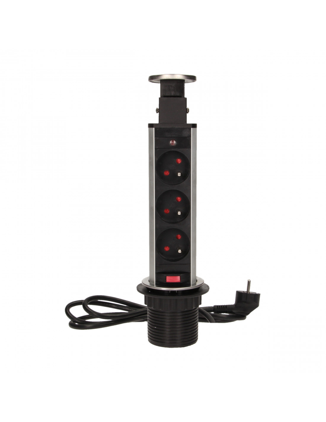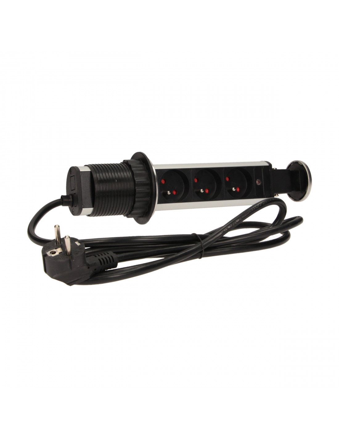 Zestaw trzech gniazd sieciowych z uziemieniem i przesłonami torów prądowych w obudowie chowanej w blat. Urządzenie przeznaczone do montażu w stołach konferencyjnych, blatach mebli biurowych i kuchennych. Posiada wysuwany panel z gniazdami, dodatkową blokadę oraz przewód o długości 1,8 m. Stal nierdzewna INOX.