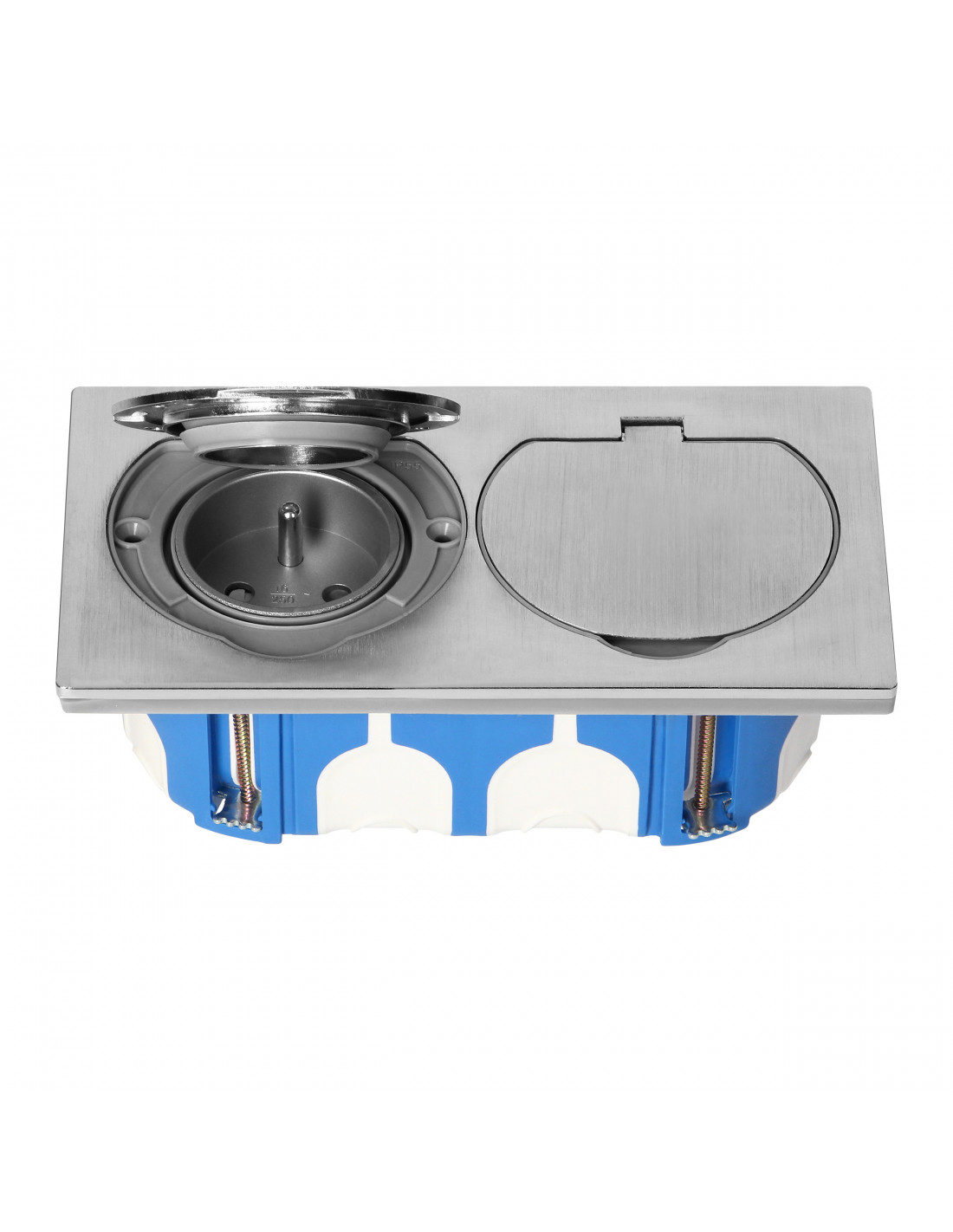 Podwójne gniazdo sieciowe typu E z uziemieniem i przesłonami torów prądowych, w obudowie z klapką zabezpieczoną dodatkową uszczelką. Produkt sprzedawany w zestawie z wiatroszczelną puszką montażową. Zastosowanie takiego rozwiązania gwarantuje wysoki stopień szczelności (IP55) zarówno w części zewnętrznej gniazda, jak i wewnętrznej. Wykonany ze stali nierdzewnej produkt jest eleganckim i bardzo estetycznym rozwiązaniem wszędzie tam, gdzie istnieje potrzeba podłączenia dodatkowych odbiorników.