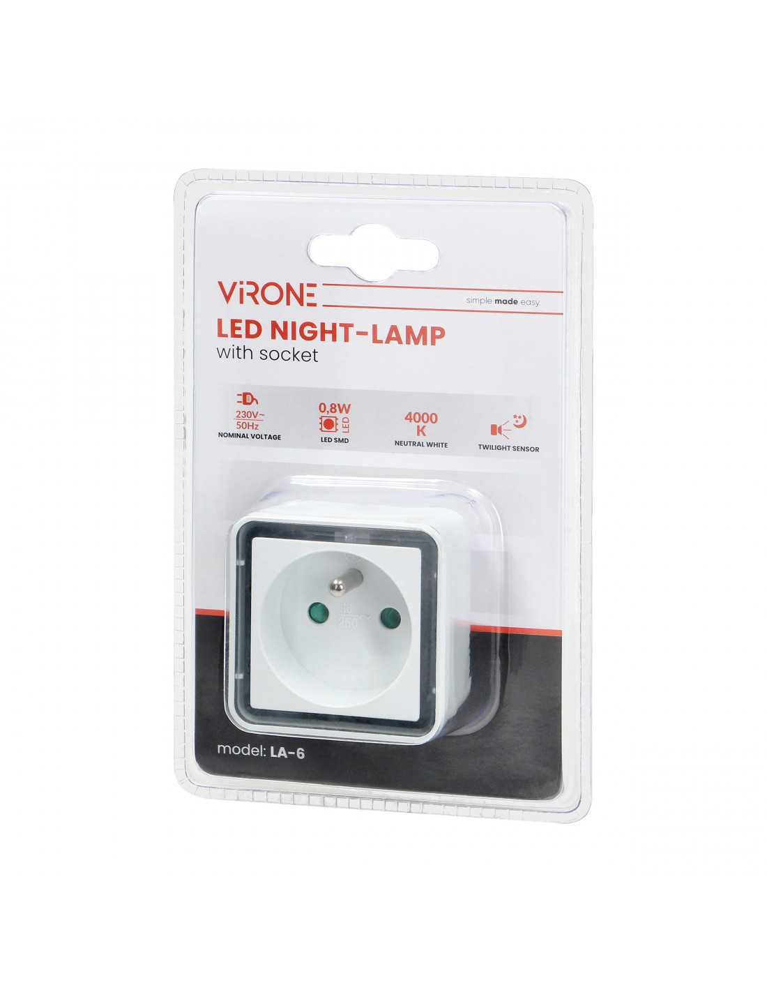Lampka LED z dodatkowym gniazdem 230V przeznaczona jest do oświetlania pokojów dziennych, korytarzy, sypialni, pokoi dziecięcych, kuchni i innych pomieszczeń. Wbudowany czujnik zmierzchowy powoduje, że lampka załącza się tylko przy zmniejszeniu natężenia światła poniżej 10 lux, dzięki czemu nie świeci się bez potrzeby, lecz zapewnia oświetlenie wtedy, gdy jest ono faktycznie przydatne. Temperatura światła wynosi 4000 K. Jest to białe światło coraz częściej wykorzystywane w aranżacjach nowoczesnych, gdzie stawia się na minimalizm i prostotę. Światło w tej barwie to kompromis między ciepłym światłem, a niebieskim, zimnym oświetleniem.