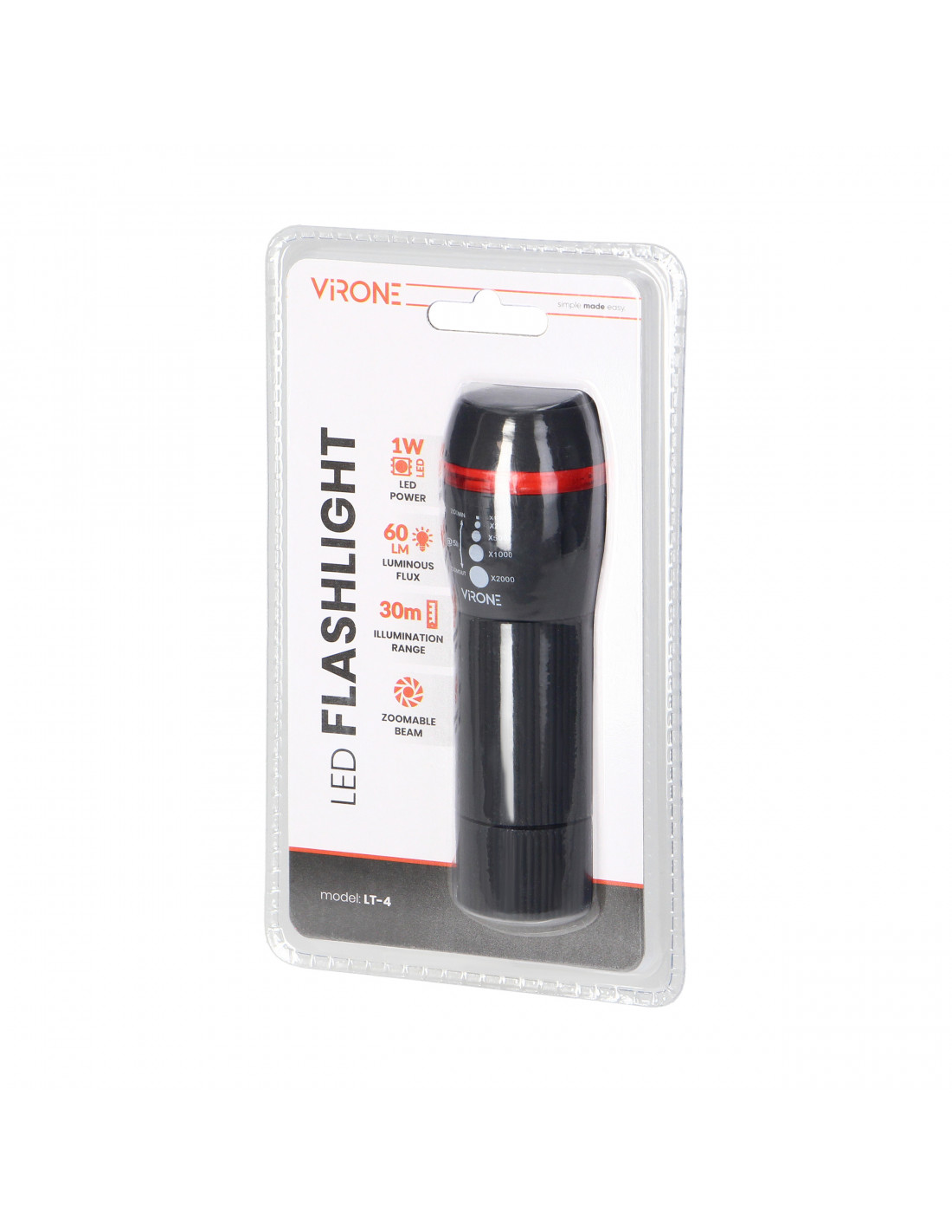 Nasza latarka LED ma niewielkie rozmiary, jest bardzo łatwa w użyciu i sprawdzi się w każdych warunkach - na zewnątrz, w domu czy na kempingu. Źródło światła stanowi dioda LED T6 1W, która emituje jasne światło o mocy 60 lm. Ta kieszonkowa latarka posiada 2 tryby pracy. Dodatkowa funkcja ZOOM pozwala dostosować wiązkę światła od x1, x250, x500x, x1000, x2000 i zapewnić zasięg świecenia do 30m. Lekko porowata rękojeść zapewnia pewny uchwyt. Latarka wyposażona jest w smycz na nadgarstek. Produkt zasilany bateriami 3 x AAA (brak w zestawie).