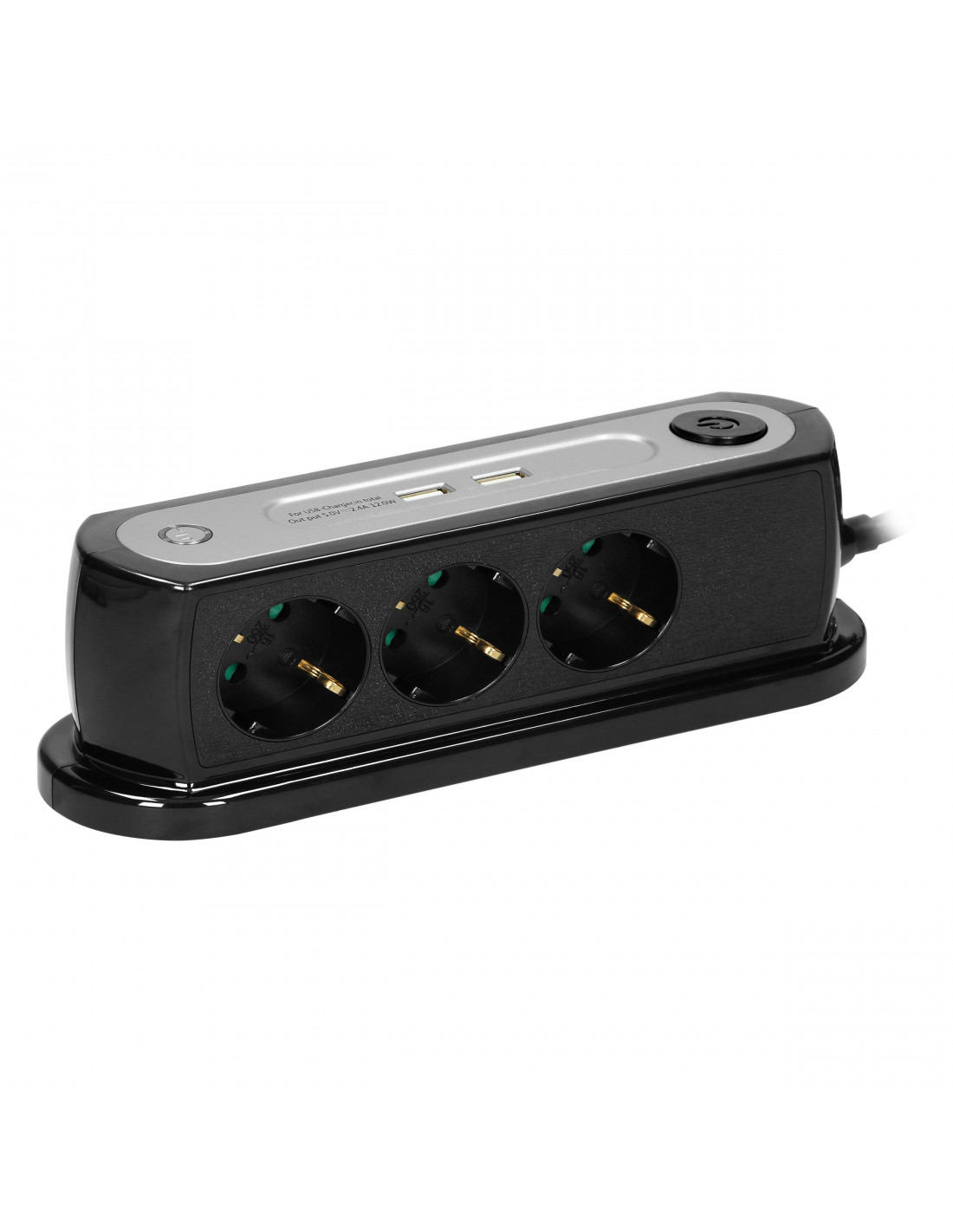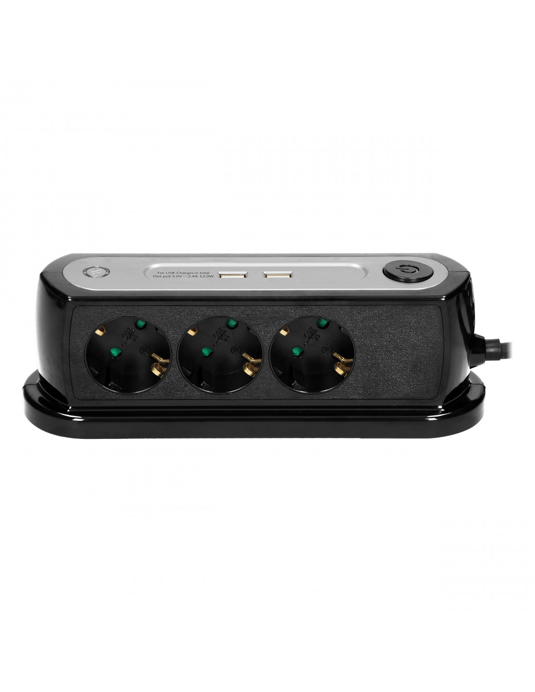 Nabiurkowa listwa zasilająca to doskonałe i praktyczne urządzenie, które umożliwia podłączenie sprzętu różnego typu, również tego ładowanego przez port USB. Posiada 3 gniazda prądowe schuko z zabezpieczeniem przeciwprzepięciowym (typ 3) oraz 2 porty USB, które tak wkomponowano w obudowę urządzenia, by zajmowało ono mało miejsca na blacie biurka. Listwa dodatkowo wyposażona jest w wyłącznik główny oraz kabel zasilający o długości 1,4m.