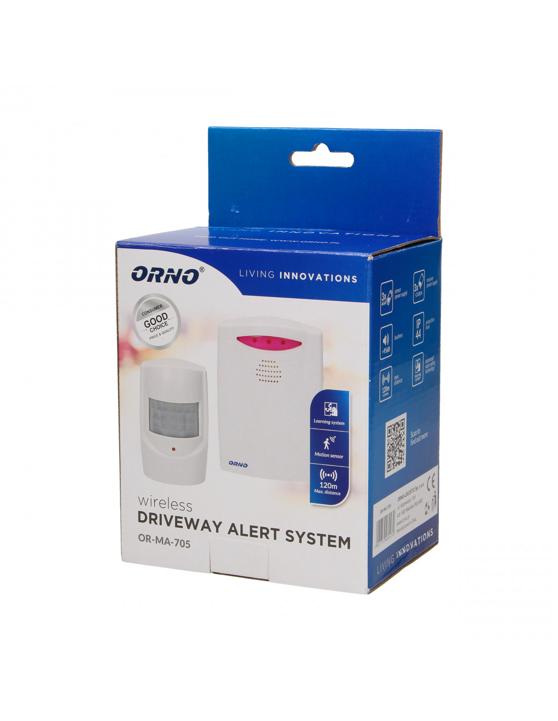 Czujnik ruchu do kontroli drzwi wejściowych, korytarzy, pomieszczeń magazynowych, piwnic, wjazdów, parkingów itp., z powiadomieniem na pager (odbiornik), sygnalizacja słabych baterii, zasięg w terenie otwartym: 120 m, zasięg wykrywania ruchu czujnika: 7 m, kąt widzenia czujnika ok. 45°, wodoodporny czujnik.