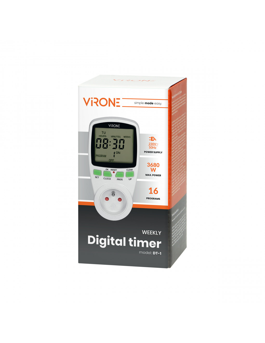 Programator służy do ustawiania momentu włączania i wyłączania urządzeń elektrycznych w określonym przedziale czasowym. Może sterować pracą dowolnego urządzenia elektrycznego jak np. oświetlenie, klimatyzator, ogrzewacz wody, kuchenka elektryczna. Posiada 16 programów czasowych, cztery duże przyciski, a także duży wyświetlacz LCD zapewniający łatwą obsługę oraz czytelny i przejrzysty pomiar.