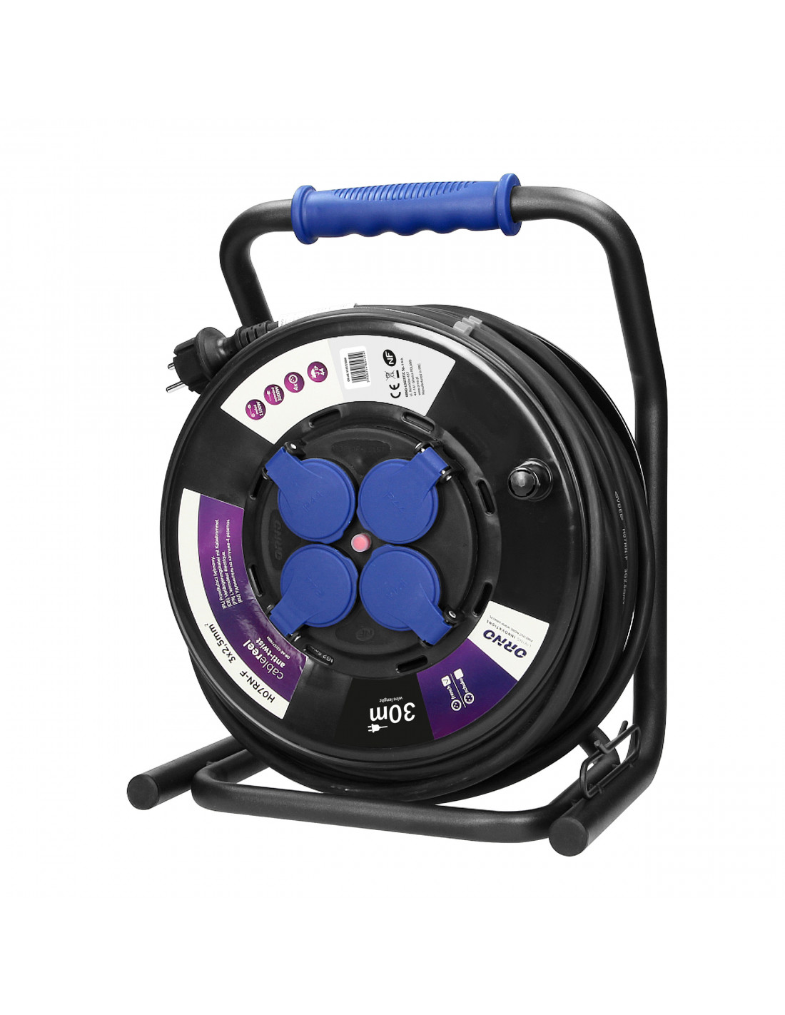 Przedłużacz na zwijanym bębnie z innowacyjnym systemem anti-twist (stałe gniazda), unikatowym, metalowym stojakiem CUBE oraz zabezpieczeniem przeciążeniowym w postaci wyłącznika termicznego. Kabel gumowy, olejoodporny H07RN-F o długości 30m. Posiada 4 gniazda sieciowe z uziemieniem, przesłonami torów prądowych oraz pokrywami uszczelniającymi, które chronią przed zabrudzeniami i wilgocią, wygodny, gumowy uchwyt do przenoszenia, obracający się uchwyt do zwijania kabla, blokadę obrotu bębna oraz wtyczkę zalewaną IP44. Przystosowany do ciężkich warunków użytkowania również na zewnątrz.