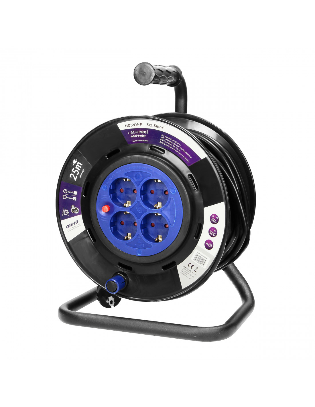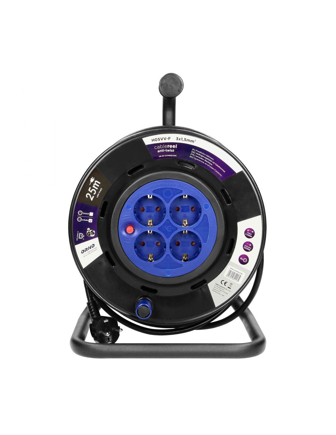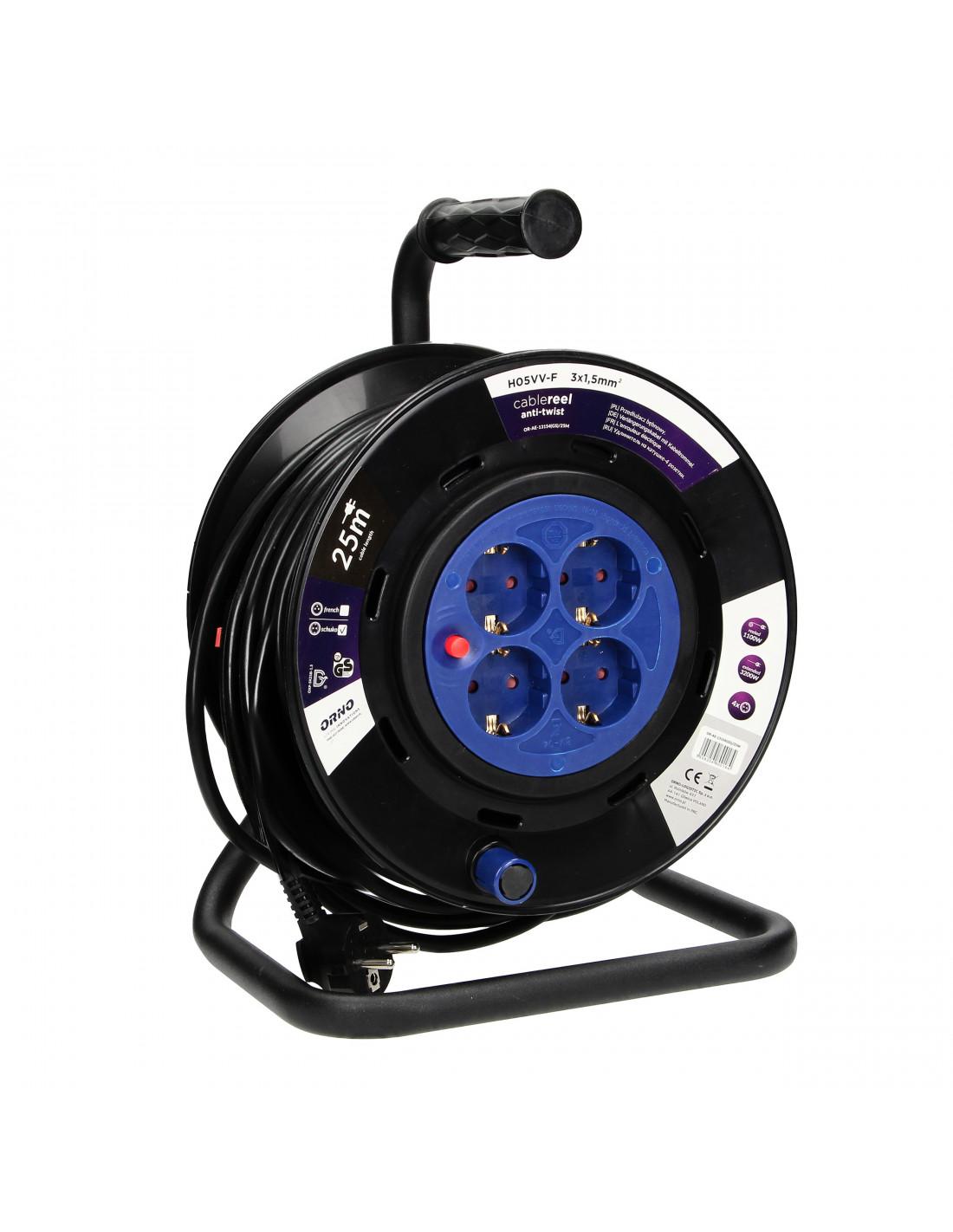 Przedłużacz na zwijanym bębnie z innowacyjnym systemem anti-twist (stałe gniazda) oraz zabezpieczeniem przeciążeniowym w postaci wyłącznika termicznego. Posiada 4 gniazda sieciowe (typu schuko) z uziemieniem, przesłonami torów prądowych, wygodny, gumowy uchwyt do przenoszenia, obracający się uchwyt do zwijania kabla, blokadę obrotu bębna oraz wtyczkę zalewaną IP44. Przystosowany do ciężkich warunków użytkowania np. do warsztatu, na budowę itp.