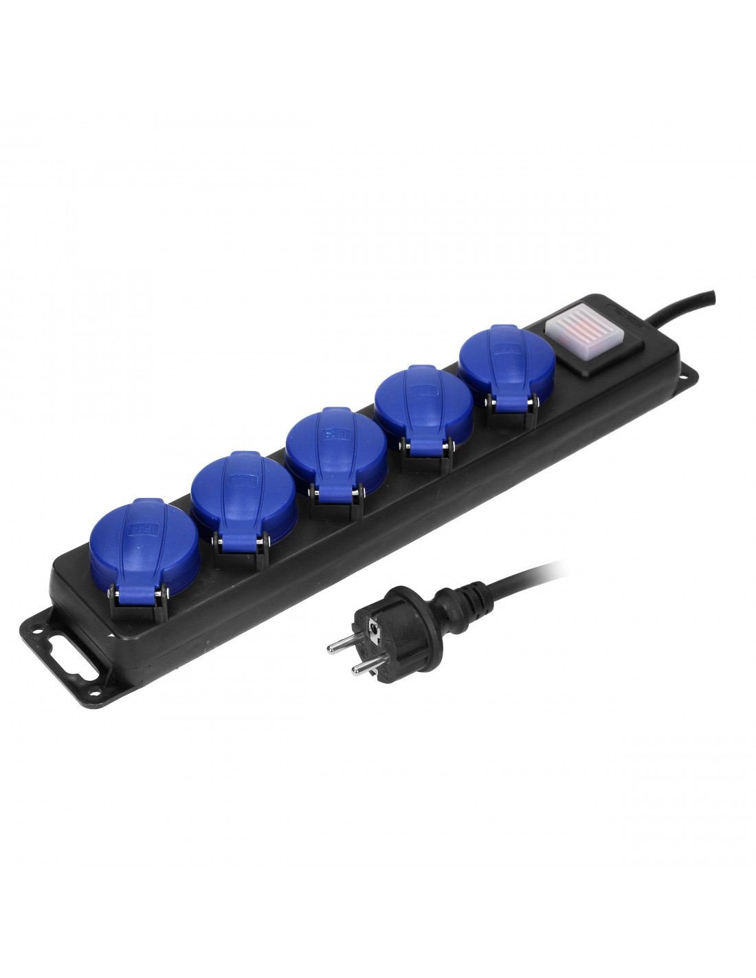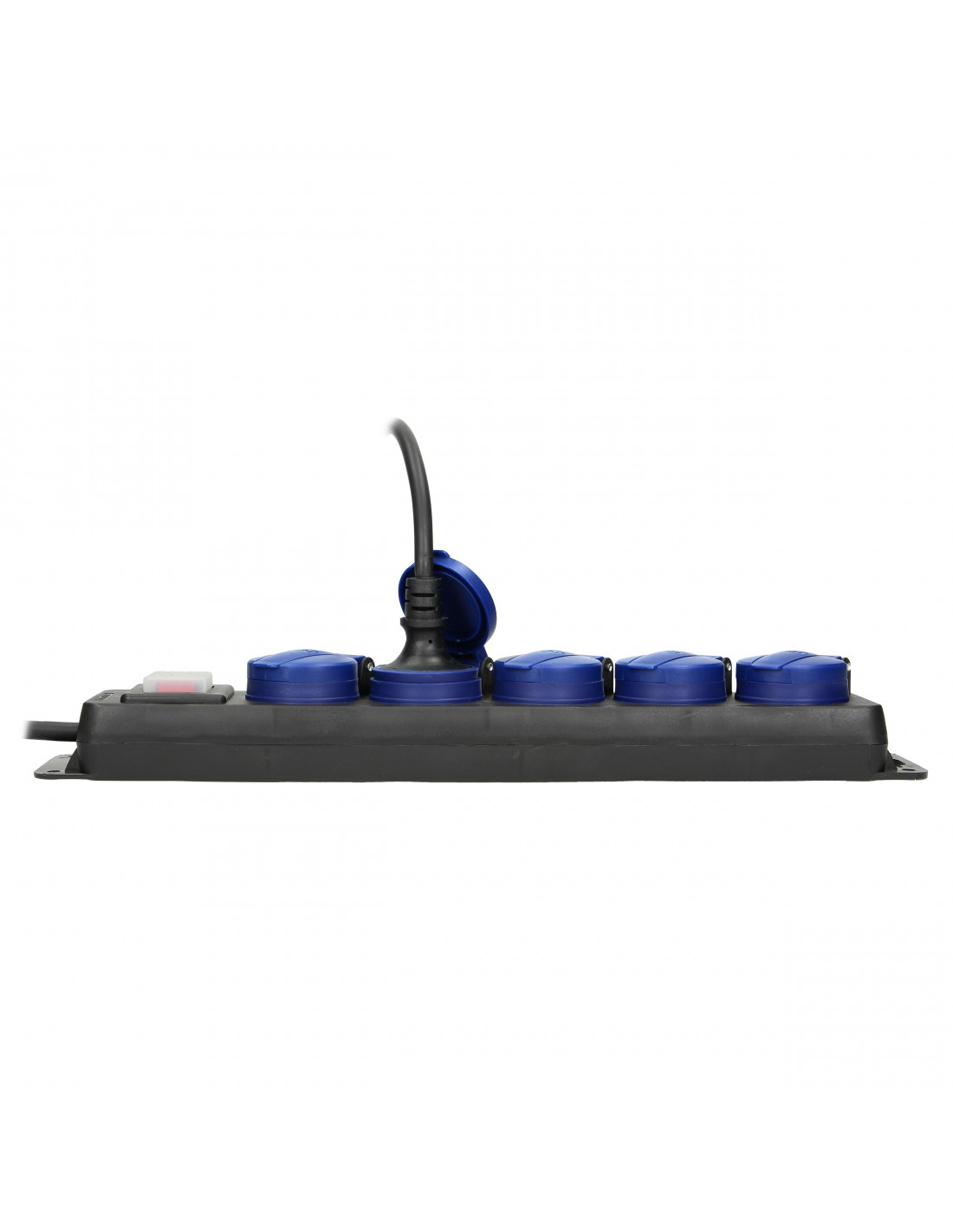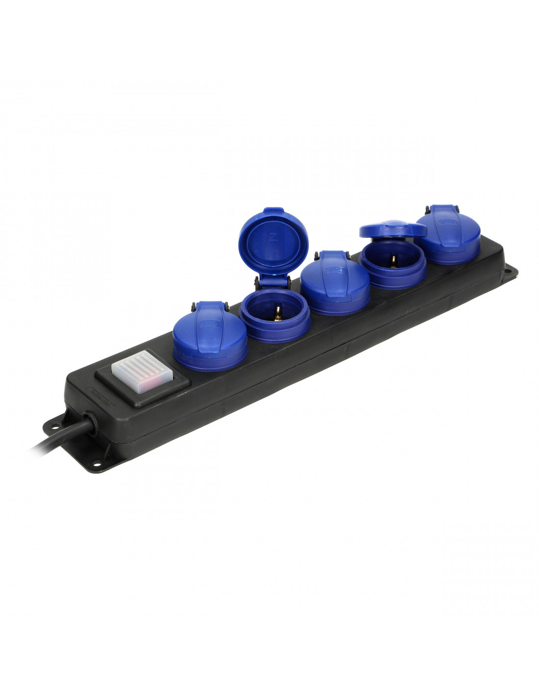 Przedłużacz warsztatowy, bryzgoszczelny z wyłącznikiem i z kablem w izolacji gumowej. Posiada 5 gniazd sieciowych typu schuko z uziemieniem i przesłonami torów prądowych oraz pokrywami uszczelniającymi, które chronią przed zabrudzeniami i wilgocią. Zawieszka ułatwia montaż w bezpiecznym miejscu, a dodatkowe otwory służą do stałego montażu na stanowisku pracy.