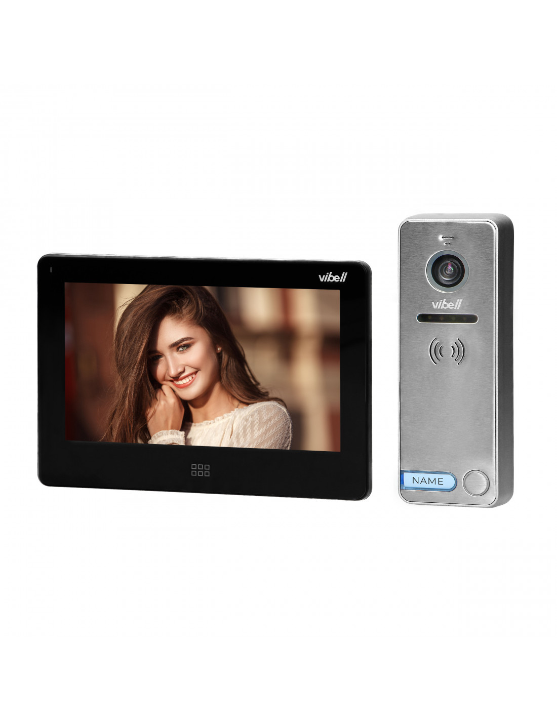 Przykładowy zestaw VIBELL: Zestaw wideodomofonowy FELIS MEMO, nie wymaga słuchawki. Składa się z kolorowego, płaskiego monitora LCD 7" obsługiwanego dotykowo oraz wyjątkowo odpornej wideo kasety z kamerą szerokokątną. Posiada funkcjonalne i czytelne menu OSD, dzięki któremu błyskawicznie skonfigurujemy ustawienia parametrów monitora. Zestaw posiada dodatkowo gniazdo na karty SD oraz DVR. Zestaw posiada funkcję sterowania bramą oraz otwierania elektrozaczepu zasilanego bezpośrednio z wideo kasety. Kolor czarny.