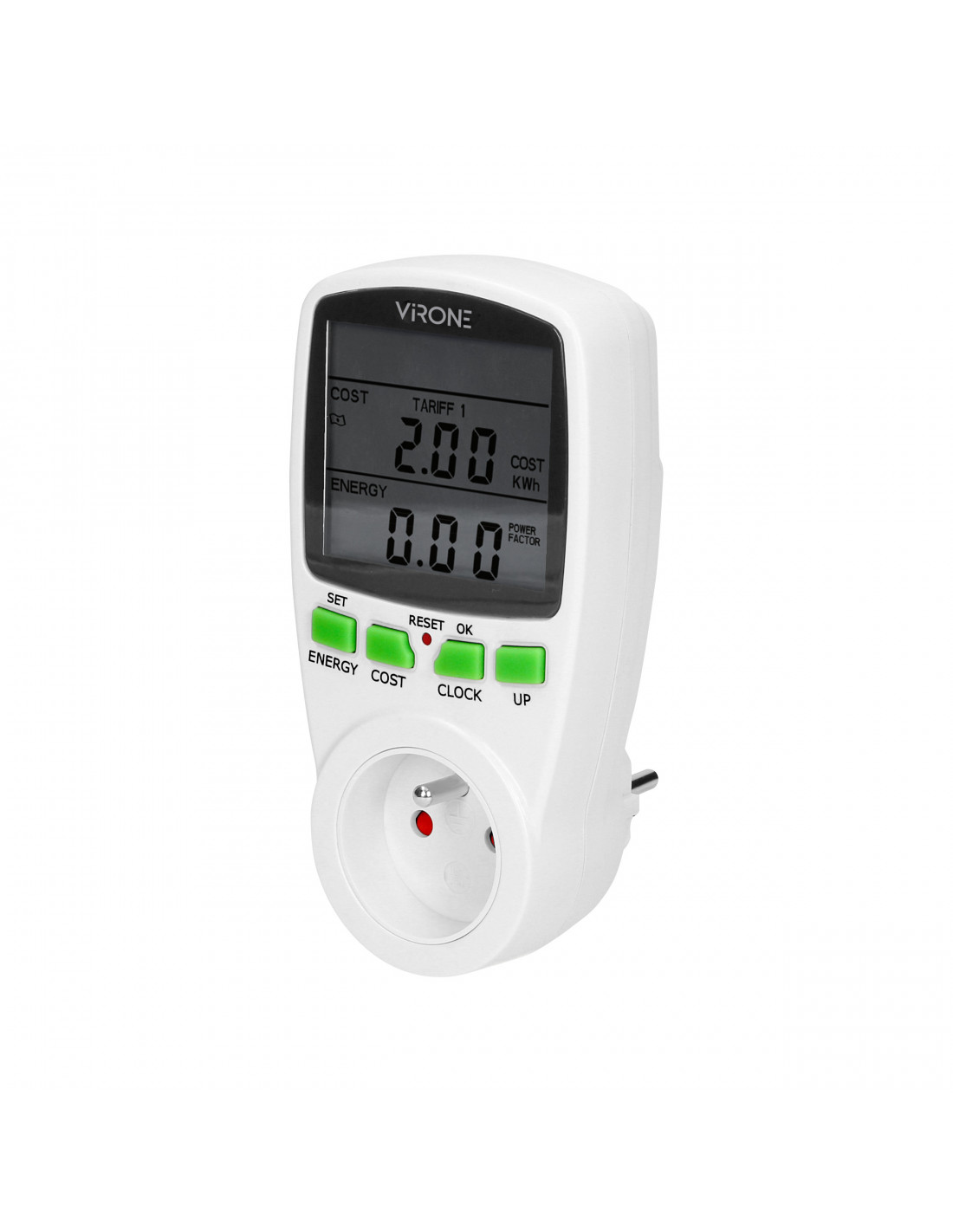 Watomierz umożliwia nam sprawdzenie zużycia prądu elektrycznego i obliczenie kosztów zużytej energii podłączonego urządzenia (2 oddzielne taryfy). Duży wyświetlacz LCD pokazuje dodatkowo aktualny czas, napięcie i natężenie prądu, współczynnik mocy, częstotliwość, maksymalne obciążenie prądu i ostrzeżenie o przeciążeniu, możliwość wprowadzenia 4 rodzajów waluty. Wewnętrzny akumulator: 2 × 1,5V LR44 podtrzymuje ustawienia urządzenia w razie braku prądu.
