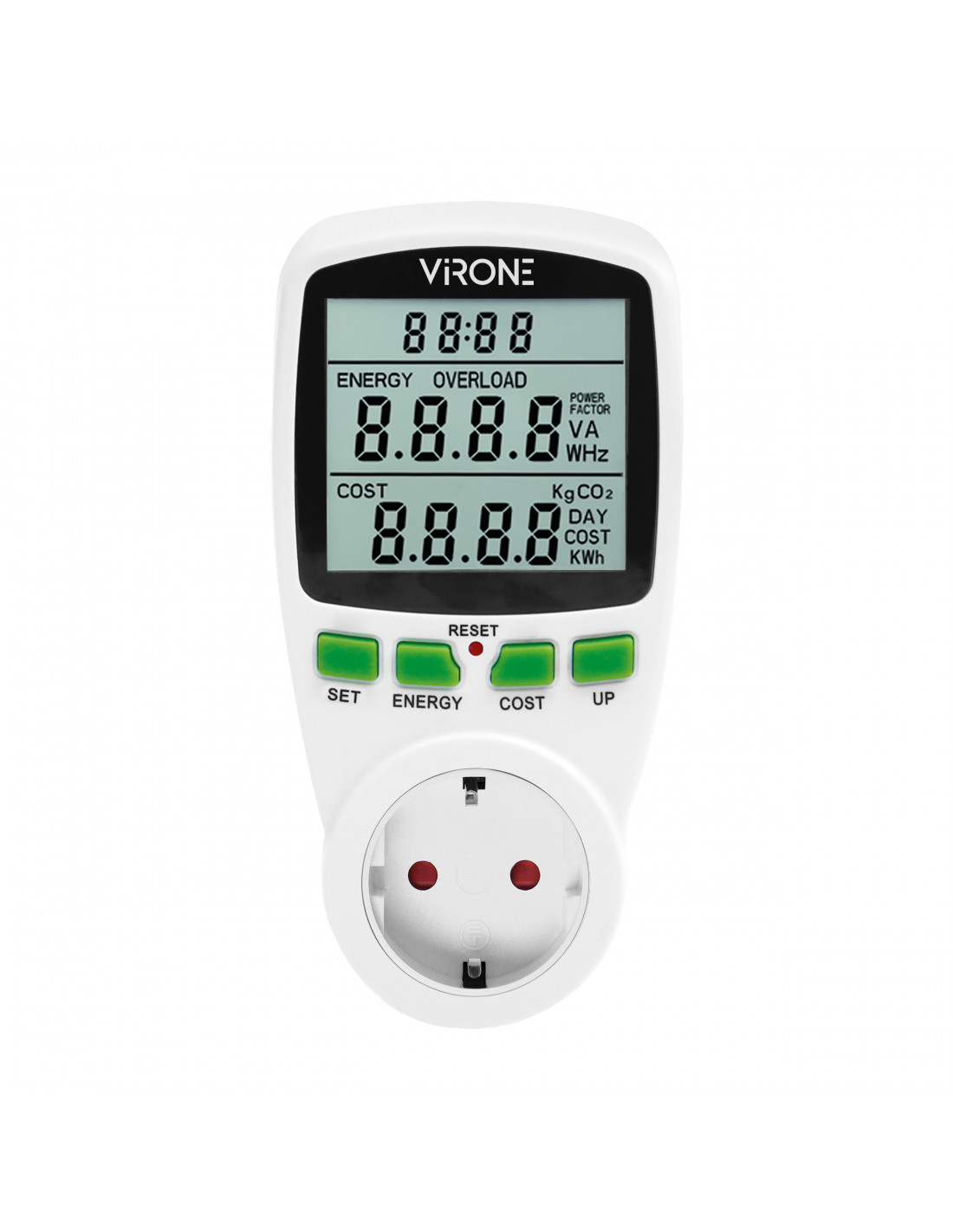 Watomierz umożliwia nam sprawdzenie zużycia prądu elektrycznego i obliczenie kosztów zużytej energii podłączonego urządzenia (obsługuje jedną taryfę). Duży wyświetlacz LCD pokazuje dodatkowo aktualny czas, napięcie i natężenie prądu, współczynnik mocy, częstotliwość, maksymalne obciążenie prądu i ostrzeżenie o przeciążeniu, możliwość wprowadzenia 4 rodzajów waluty. Wewnętrzny akumulator: 2 × 1,5V LR44 podtrzymuje ustawienia urządzenia w razie braku prądu.