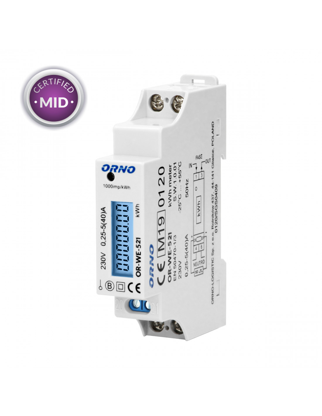 1-fazowy licznik energii elektrycznej, 100A, MID, 1 moduł, DIN TH-35mm