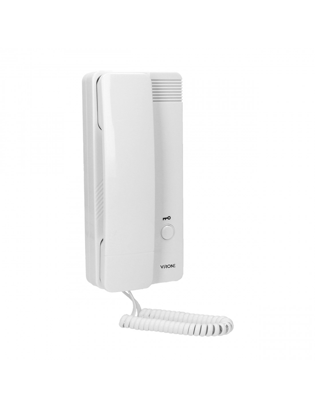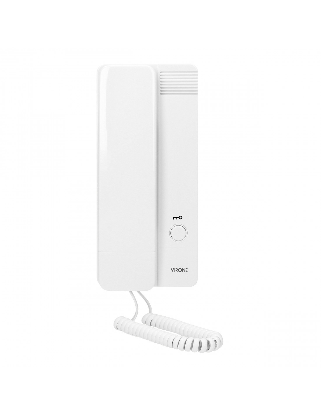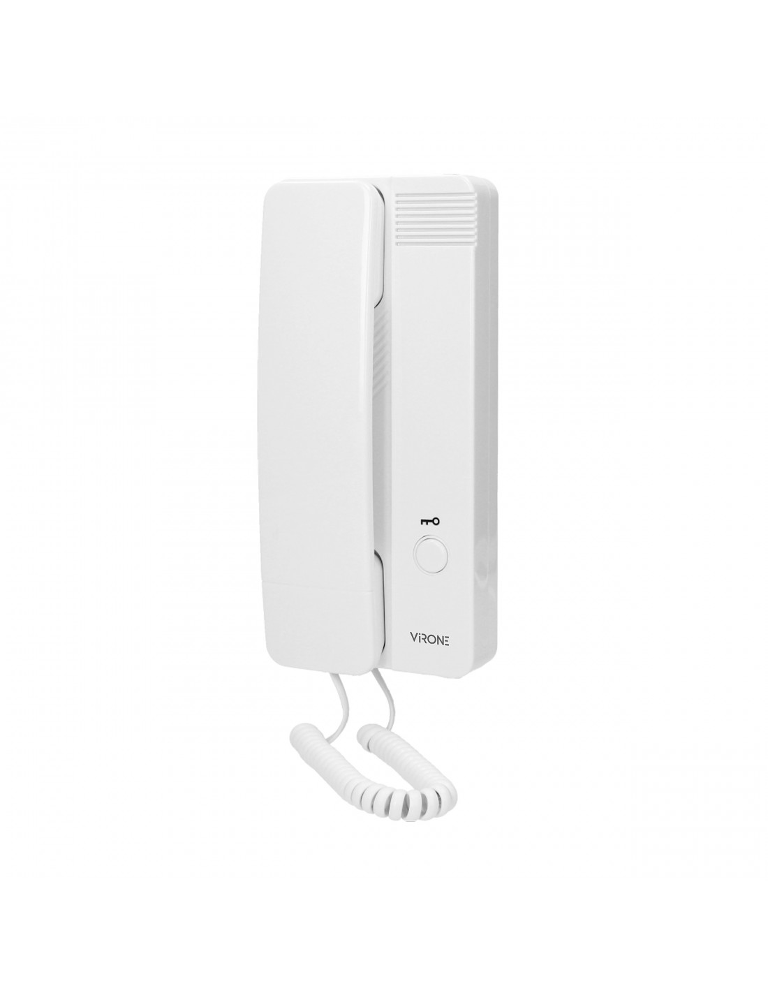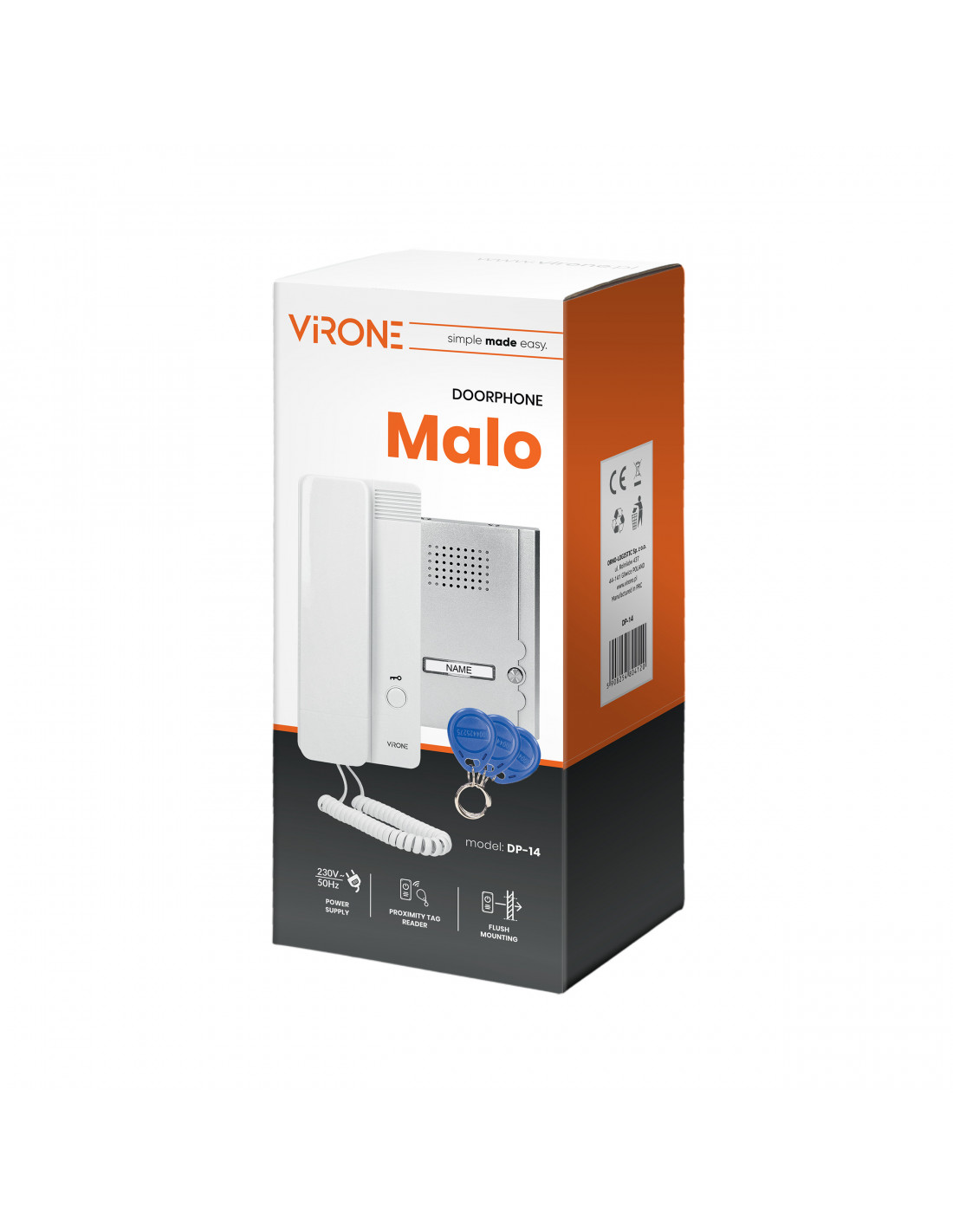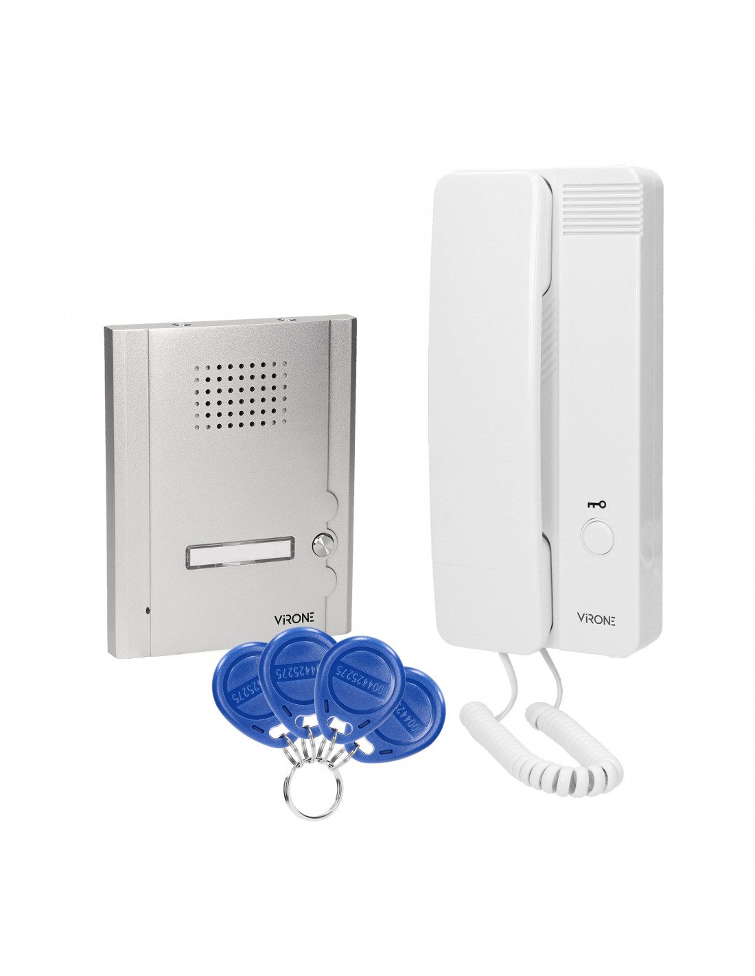 Zestaw domofonowy jednorodzinny, montaż podtynkowy, aluminiowa obudowa kasety zewnętrznej z miejscem na nazwisko, otwieranie rygla za pomocą breloka zbliżeniowego, unifon posiada wbudowany zasilacz i przewód zasilający, elektrozaczep nie wymaga dodatkowego zasilania.