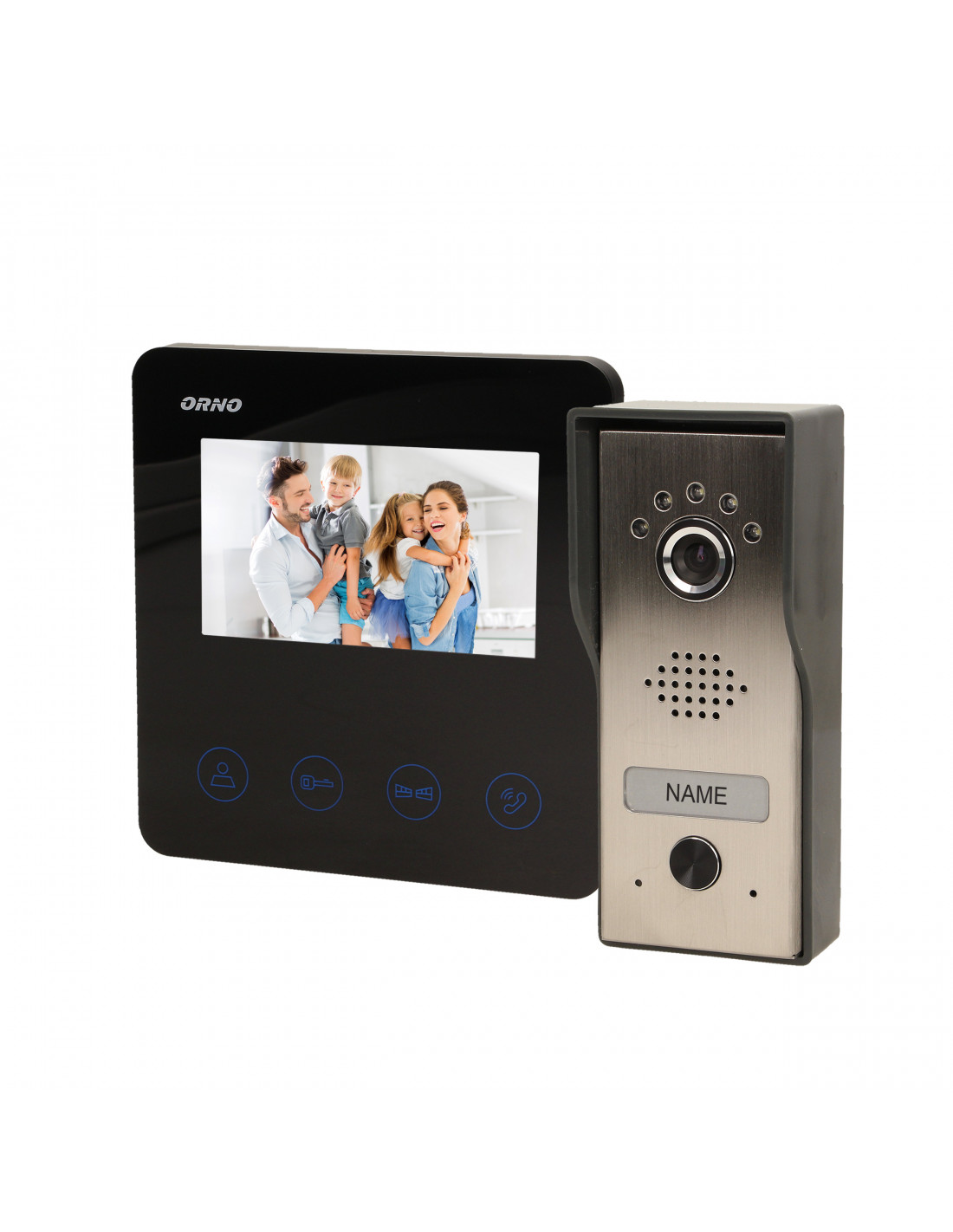 Zestaw wideodomofonowy kolorowy, ultra płaski monitor bezsłuchawkowy LCD 4,3", dotykowy panel monitora z podświetlanymi przyciskami, płynna regulacja parametrów monitora (jasności i nasycenia koloru obrazu oraz głośności rozmowy), 16 dźwięków dzwonka do wyboru, kamera do montażu natynkowego, daszek ochronny w zestawie, miejsce na nazwisko, oświetlenie jasnymi diodami LED umożliwia widzenie w nocy, funkcja interkomu po zastosowaniu dodatkowego monitora, dodatkowe sterowanie bramą, zasilanie prądem stałym z zasilacza 12V DC, elektrozaczep nie wymaga dodatkowego zasilania.