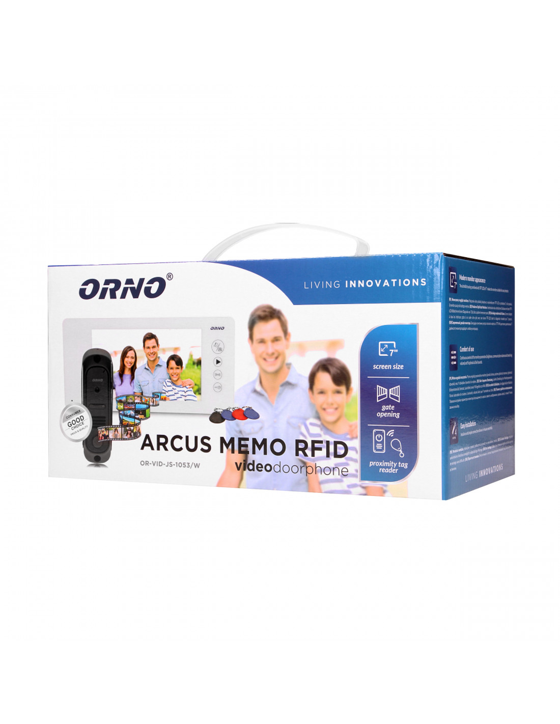 Zestaw wideodomofonowy Arcus RFID przystosowany jest do montażu w domach jednorodzinnych, firmach, kancelariach, apartamentach itp. Niewielkich wymiarów panel zewnętrzny wyposażony w ukrytą kamerę typu pin-hole można zamontować natynkowo również na wąskich słupkach, a dodatkowe oświetlenie diodami IR umożliwia wyraźny obraz również w nocy. Połączenie ultra płaskiej obudowy monitora z wyświetlaczem LCD o przekątnej 7 cali sprawia, iż wpasuje się on do każdego wnętrza. Płynna regulacja parametrów monitora oraz 9 dźwięków dzwonka do wyboru to dodatkowe zalety produktu. Urządzenie oprócz zdalnego otwierania elektrozaczepu z monitora posiada dodatkowo przycisk do sterowania bramą, a wbudowany czytnik RFiD umożliwia otwarcie furtki za pomocą breloka zbliżeniowego. Wbudowany moduł pamięci, który umożliwia zapis kolorowych obrazów z kamery i późniejsze ich odtworzenie gwarantuje większe bezpieczeństwo.